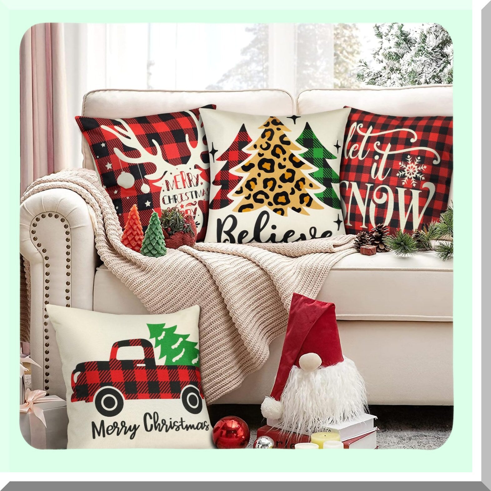 Xmas Series Pillow Covers Set - Leopard Tree Red Plaid Deer Car Pattern Cushion Cover 18x18 Inch Zippered Square Pillowcase Decorations - Pack of 4