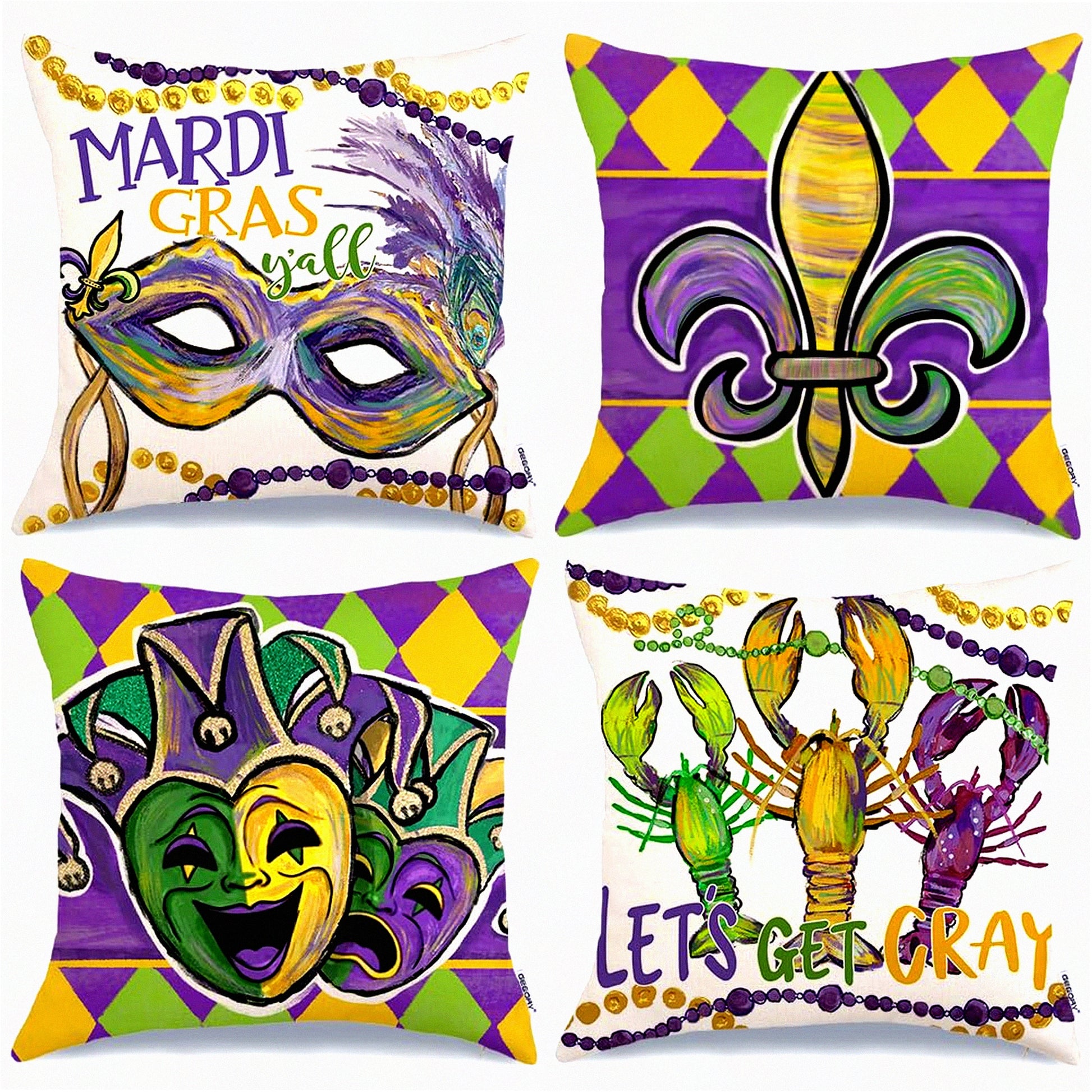 Mardi Gras Festive Pillow Cover Set - Fleur De Lis Jester Hats Beads Lobsters - Sofa Couch Cushion Decoration - 18 x 18 Inch - Pack of 4