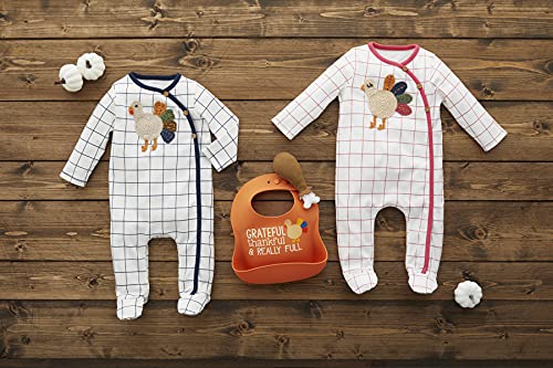 Interlock footed sleeper features handmade crochet turkey appliqu , tortoise button side placket and inner leg snap closure.