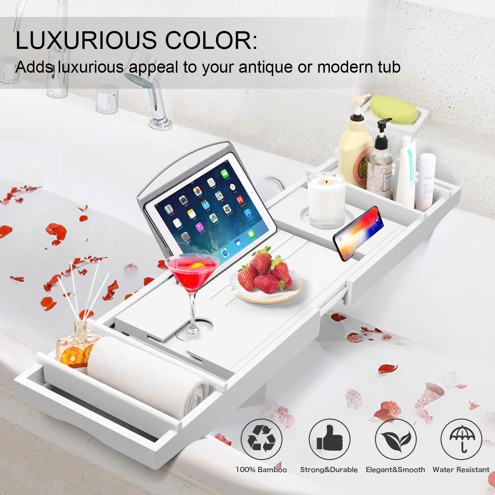 Bamboo Bathtub Caddy Tray with Book and Wine Holder,Bath Accessories Bed Tray with Extending Sides,Bathroom Organizer for Men/Women,Free Soap Holder,White
