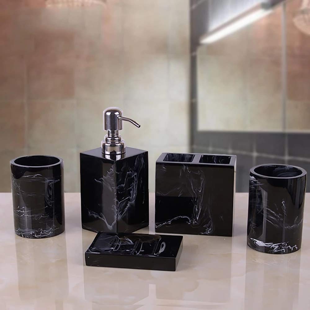 Bathroom Set in Black Marble Design Black Marble Pattern Tray Resin Bathroom Set Toothbrush Holder soap Dispenser soap Dish Mens Bathroom Accessories Set Home Deco 6PCS Set