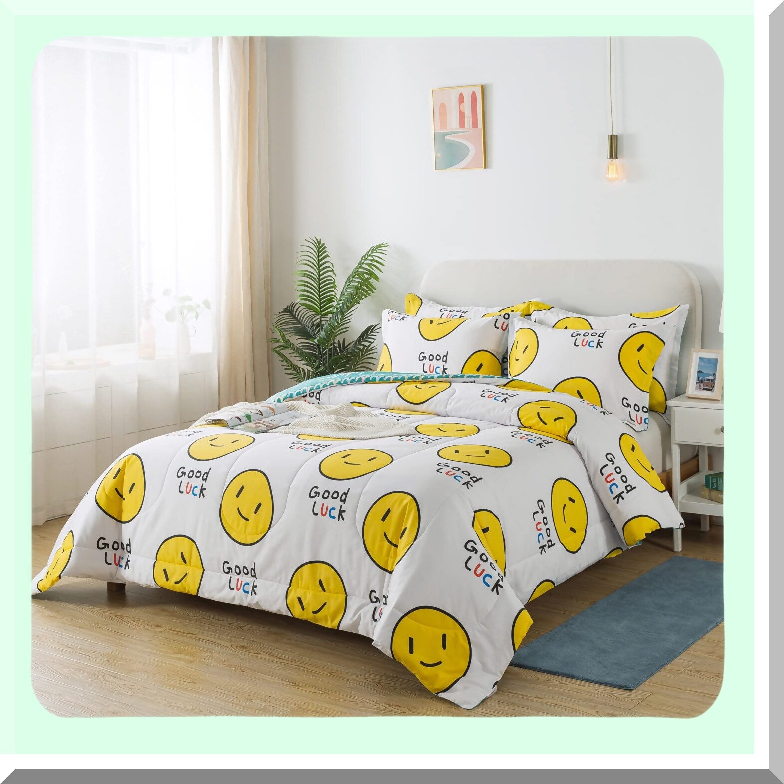 EmojiBreeze Summer Comforter Set - Lightweight White Bedding for Teen Adult Queen - Smiling Face Print - Ultra Breathable Down Alternative - Cute Emoji Style - 3Pcs Set