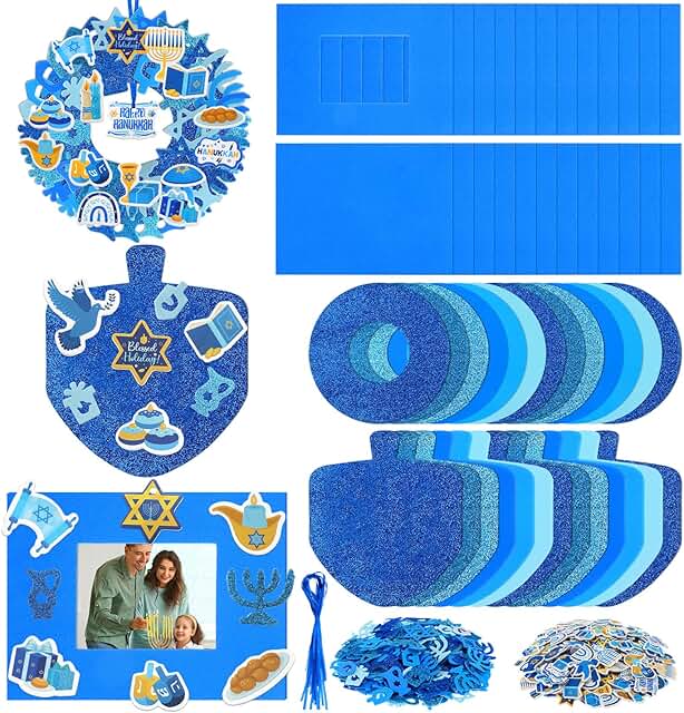 This set includes 448 foam stickers designed for Hanukkah celebrations. The stickers feature various shapes such as menorahs, candles, wreaths, and other festive symbols. They are self-adhesive and have a glitter finish, making them suitable for decorating crafts, photo frames, and party decorations. The stickers are easy to use and add a colorful, festive touch to your holiday projects.