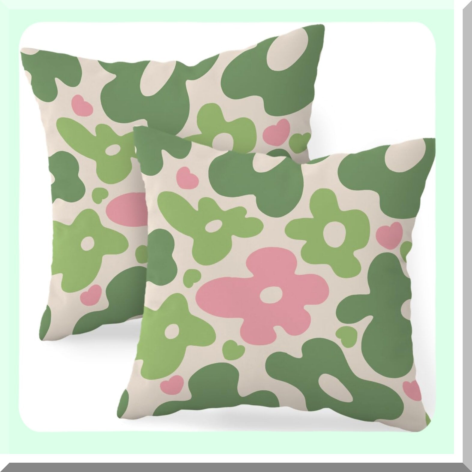 Pastel Floral Bliss Throw Pillow Covers - Set of 2, Sage Green Pink Retro 70s Flower Cases for Home Bedroom Living Room Office Decor, Ideal Gifts for Women Girls who Love Flowers