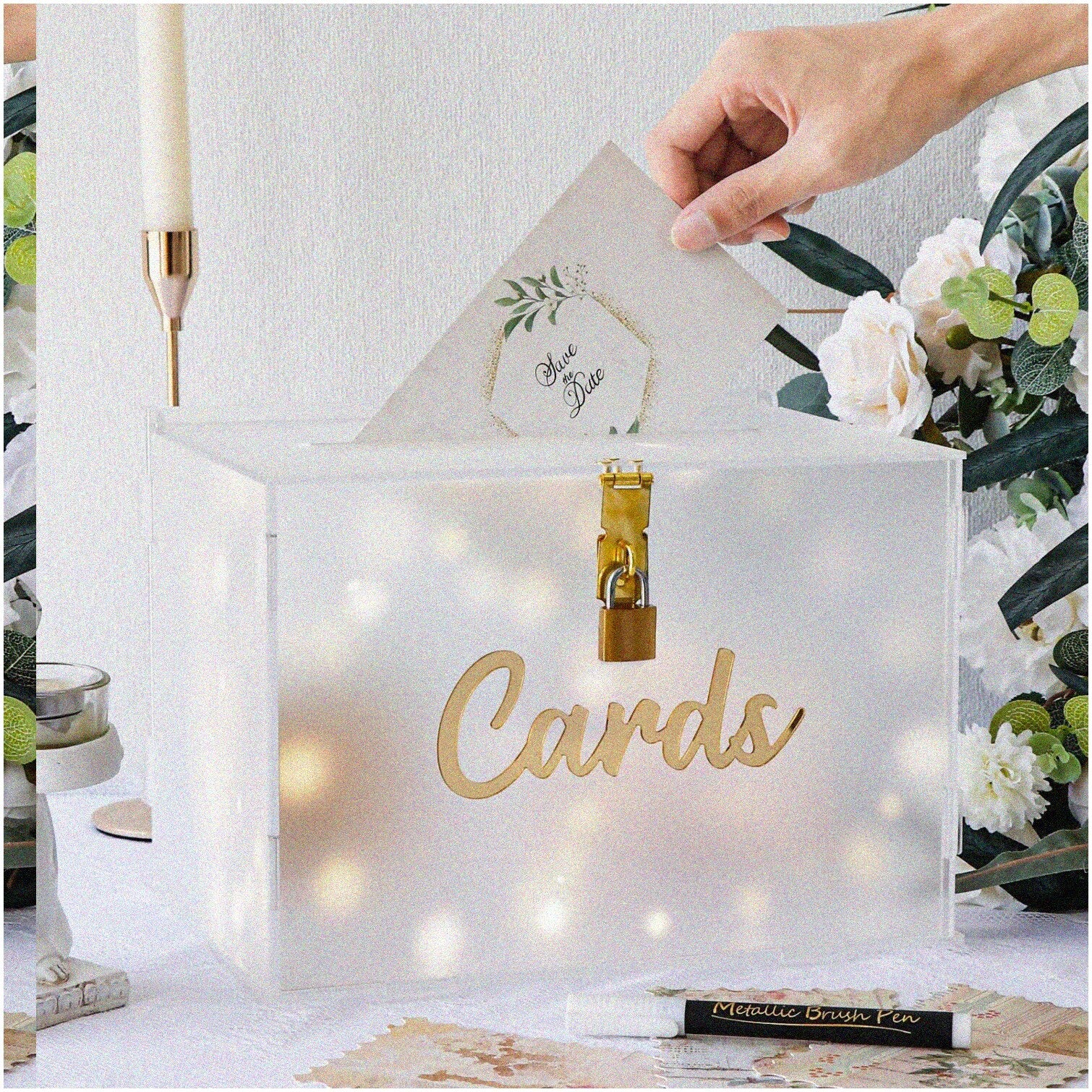 Elevate your special occasion with this frosted acrylic card box, designed to add elegance and romance. Its matte texture and gentle glow create an enchanting ambiance that captivates guests. Measuring 11x8 inches, it can hold up to 200 cards or envelopes, making it suitable for weddings, parties, graduations, birthdays, fundraisers, and more. Crafted from durable acrylic, the box is foldable, easy to assemble and disassemble, ensuring long-lasting use. The package includes a 6-sided gift box, a "cards" sticker, a delicate light string, a white erasable paint pen, a lock with two keys, installation instructions, and rubber rings for stability. The lock provides added security for your cards and gifts. Personalize the box with your own designs or words using the included pen, and peel off the protective layer for a clear finish. Perfect for storing cards, photos, and mementos, this versatile box combines functionality with charming decor.