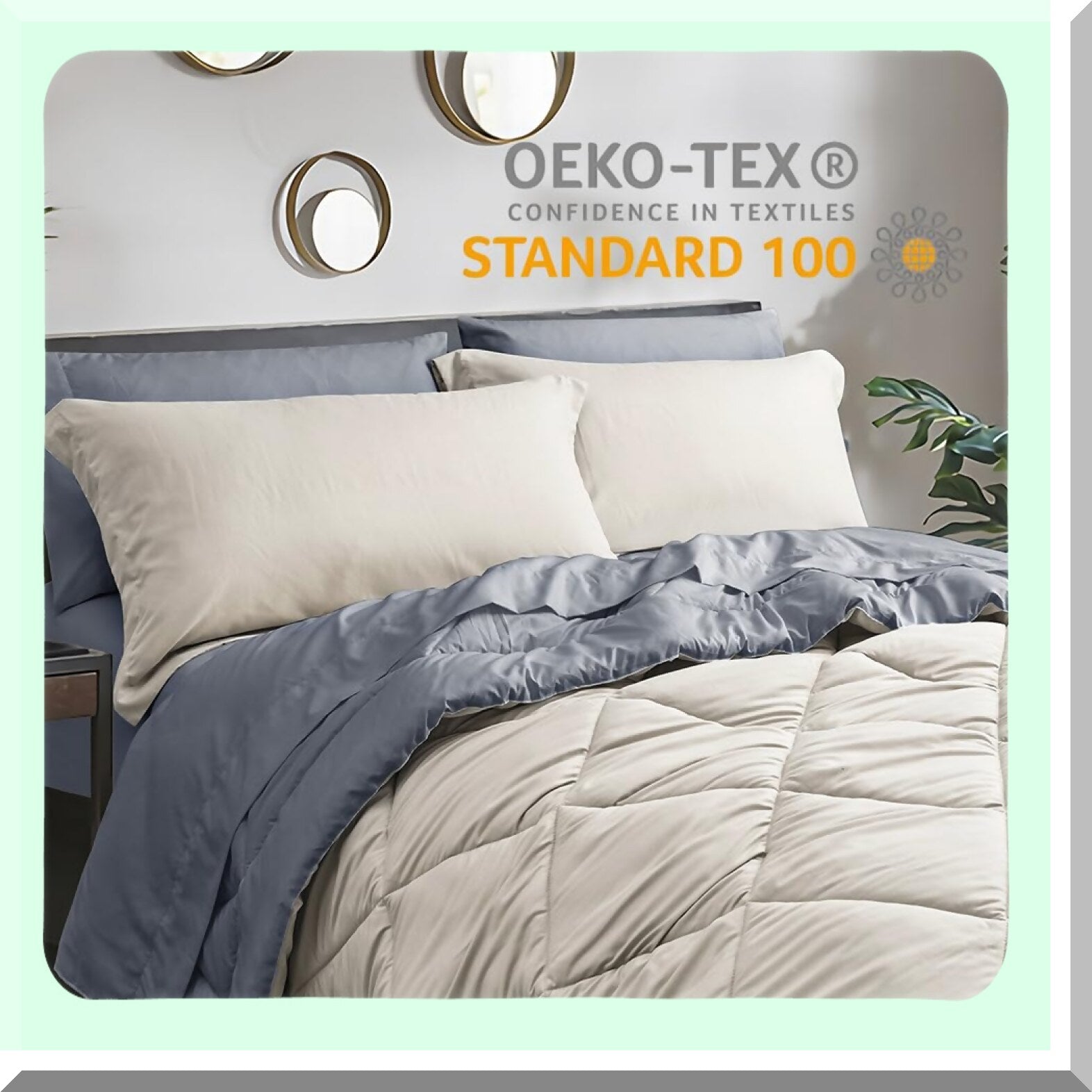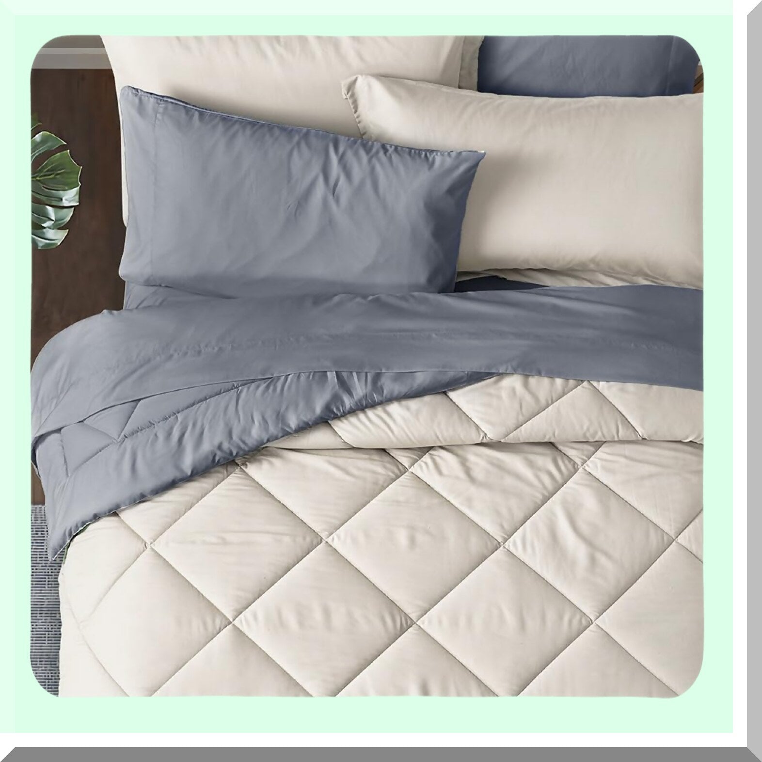 Luxury Comfort 7-Piece Queen Bedding Set - Reversible Comforter, Sheets, Pillowcases, Shams - Beige & Grey Bed in a Bag for Queen Size Bed - Complete Bedroom Set