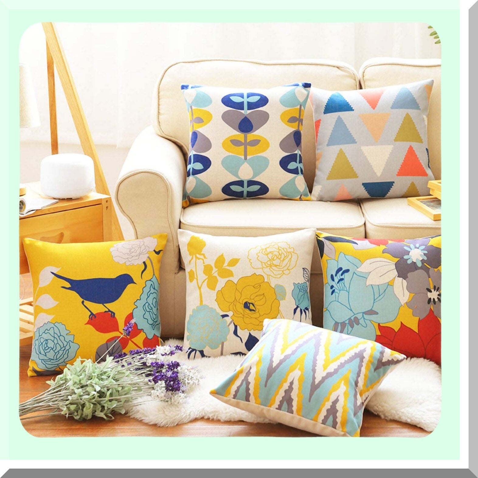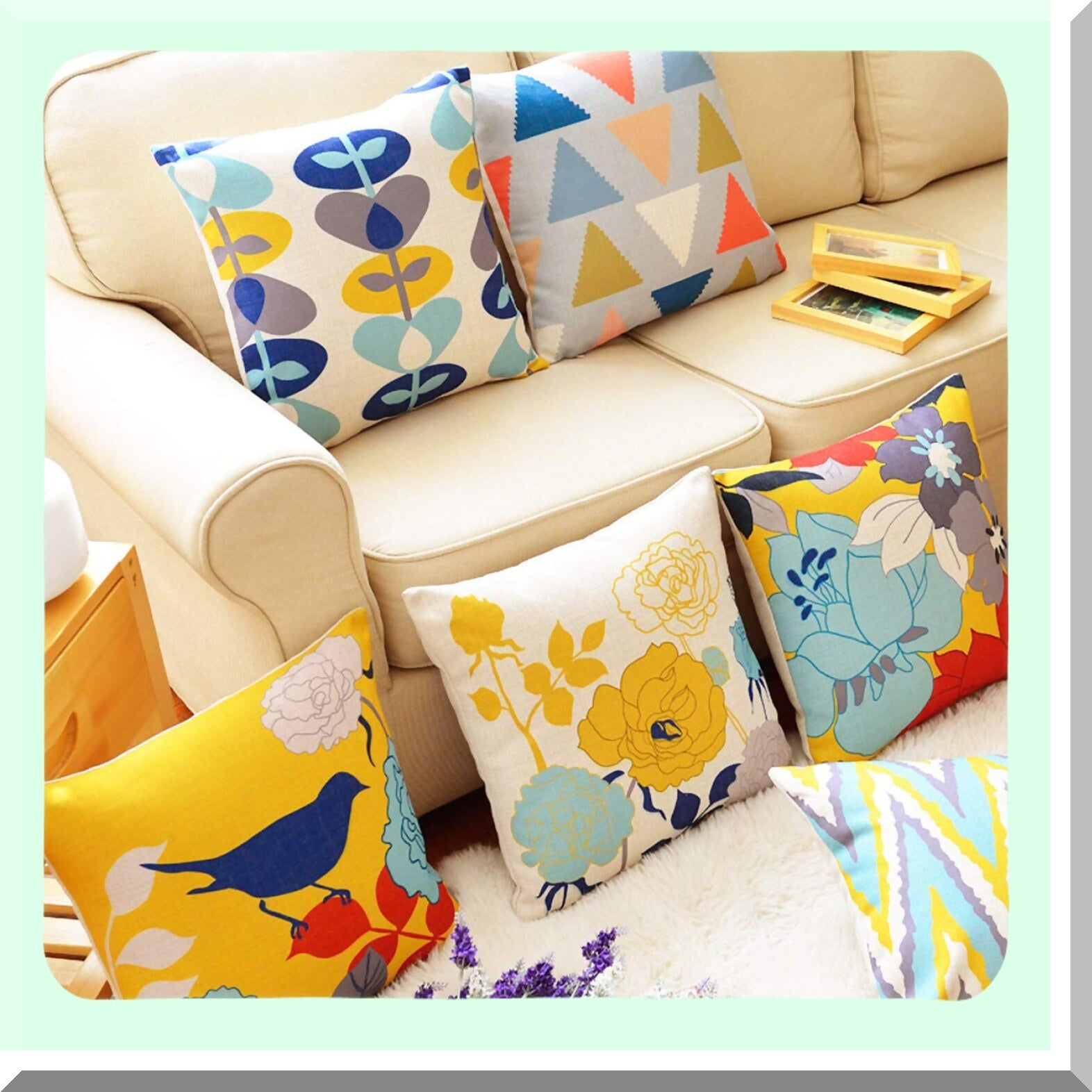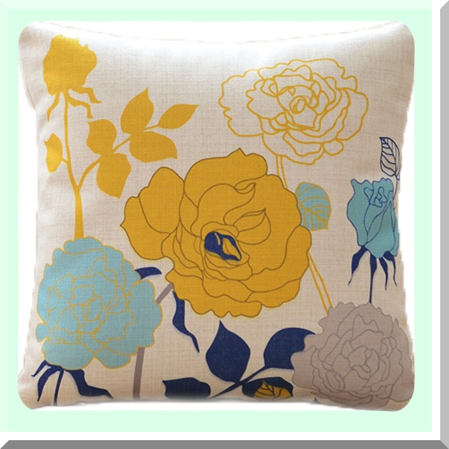 Floral Farmhouse Pillow Covers Set - Blue Yellow Cotton Linen Outdoor Throw 18x18 inch Decorative Cushion Cases for Couch Sofa Patio Porch - Pack of 2