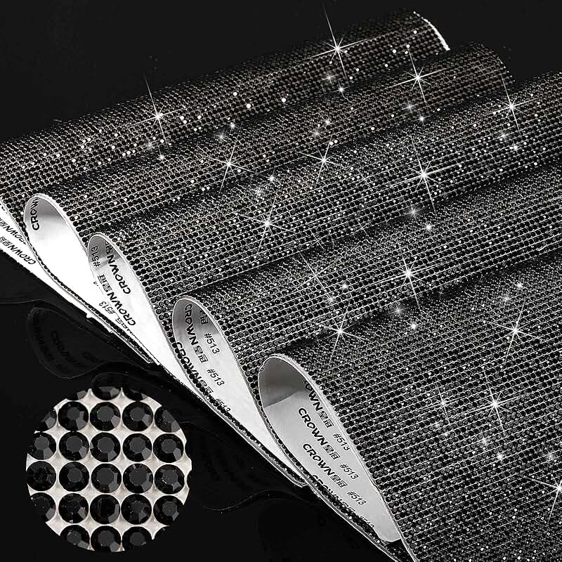 This set includes five sheets of self-adhesive rhinestone stickers, each measuring 9.4 by 7.9 inches. The sheets feature 2 mm black rhinestones suitable for decorating cars, phones, or craft projects. The rhinestones are designed to stick securely to various surfaces, allowing for easy customization and embellishment. Ideal for adding a sparkling touch to personal items or DIY projects, these stickers are simple to apply and remove.