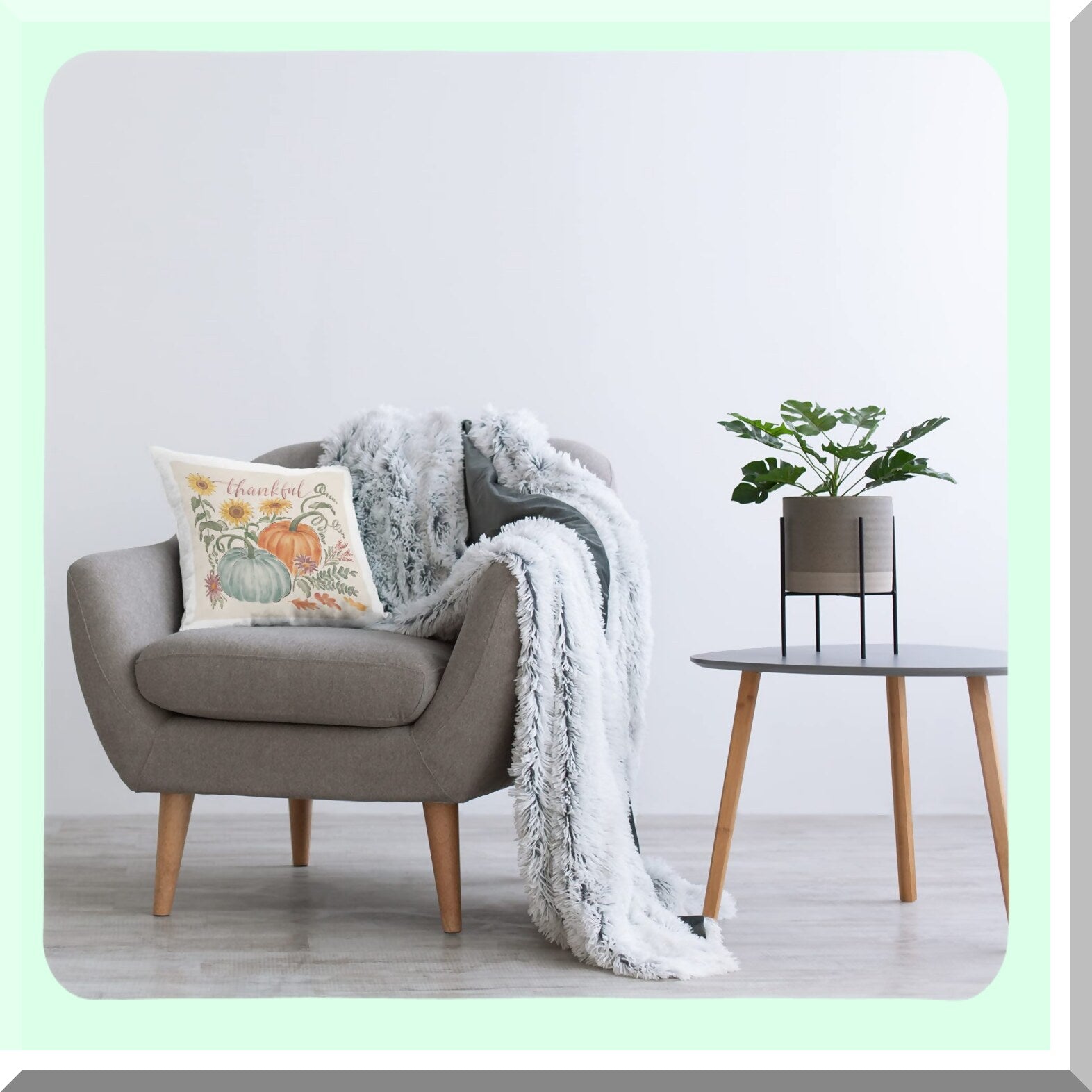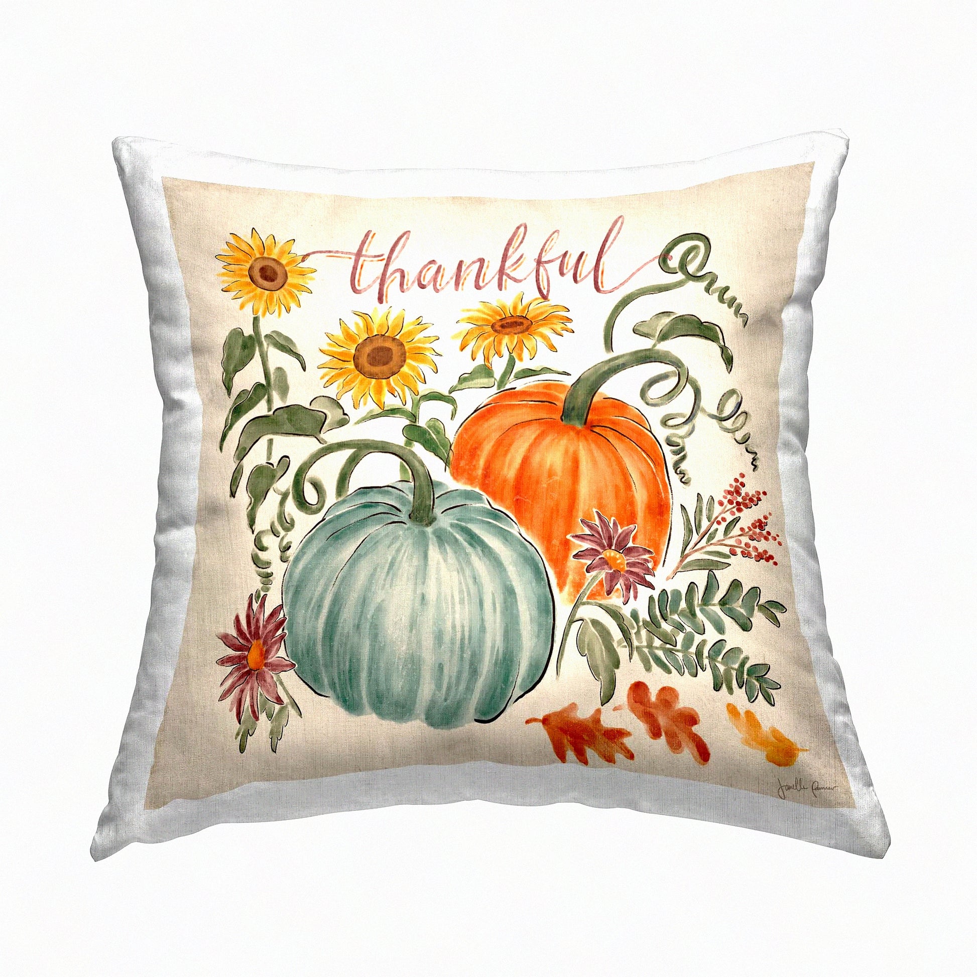Festive Botanical Calligraphy Throw Pillow - Thankful Pumpkins & Flowers Design - 18x18 Multi-Color Cushion by Janelle Penner