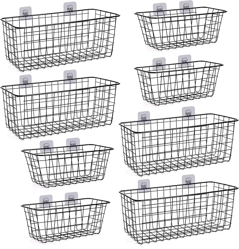 This set includes eight wire storage baskets designed for versatile organization around the home. The baskets are suitable for use in kitchens, bathrooms, freezers, pantries, closets, laundry rooms, cabinets, and garages. They come in two sizes: four large and four medium, providing flexible storage options. Made from durable metal, these wall-mounted containers help keep spaces tidy by organizing items efficiently. The open wire design allows for visibility and easy access to stored items. Ideal for storing household essentials, cleaning supplies, tools, or pantry goods, these baskets help maximize storage space and maintain a clutter-free environment. Easy to install on various surfaces, they are a practical addition to any room needing organized storage solutions. Their sturdy construction ensures long-lasting use, making them suitable for everyday household organization needs.
