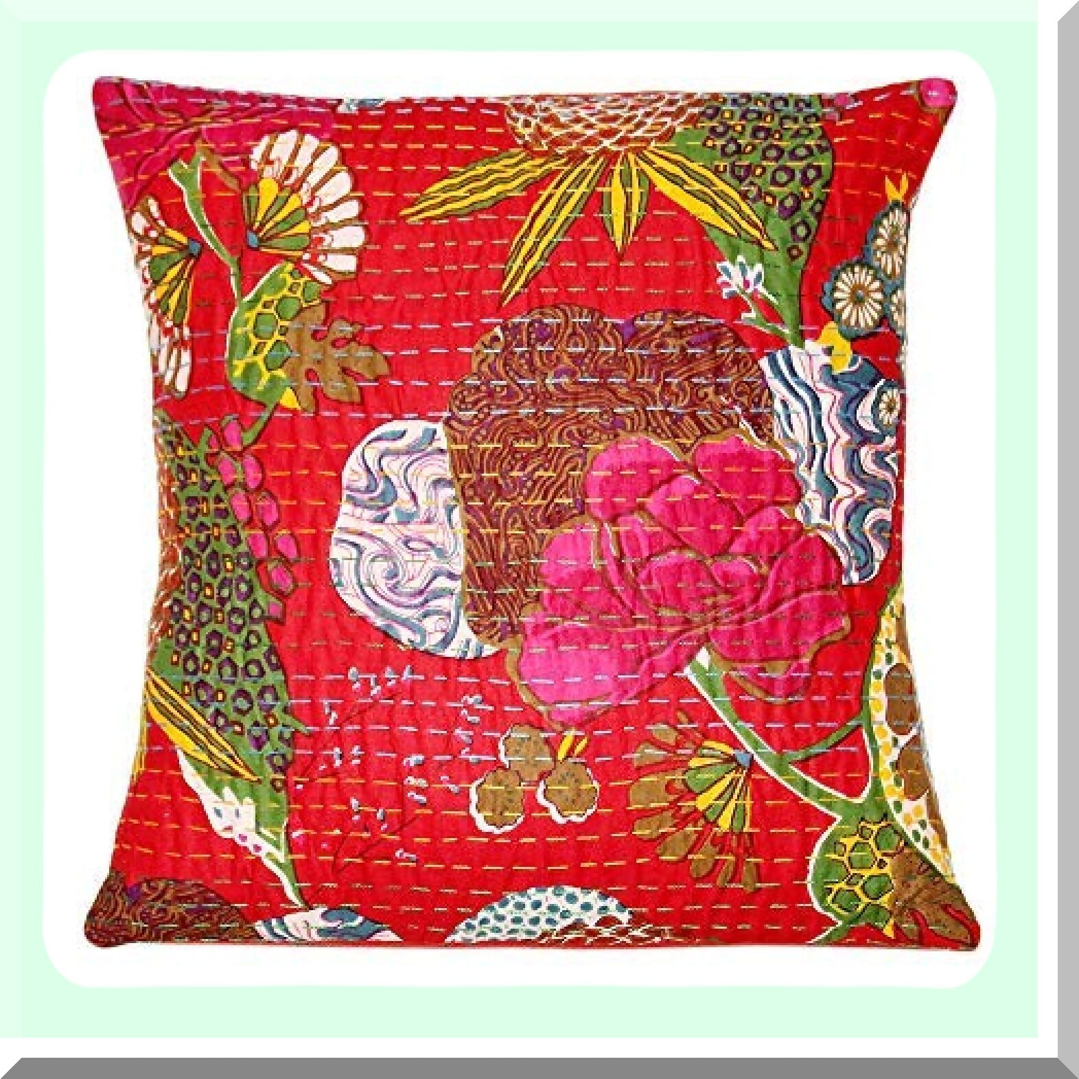Boho Chic Kantha Pillow Set - 5 Pcs White Embroidered Cushion Covers - Vintage Floral Fruit Print - Traditional Cotton Home Decor - 16X16 Inches