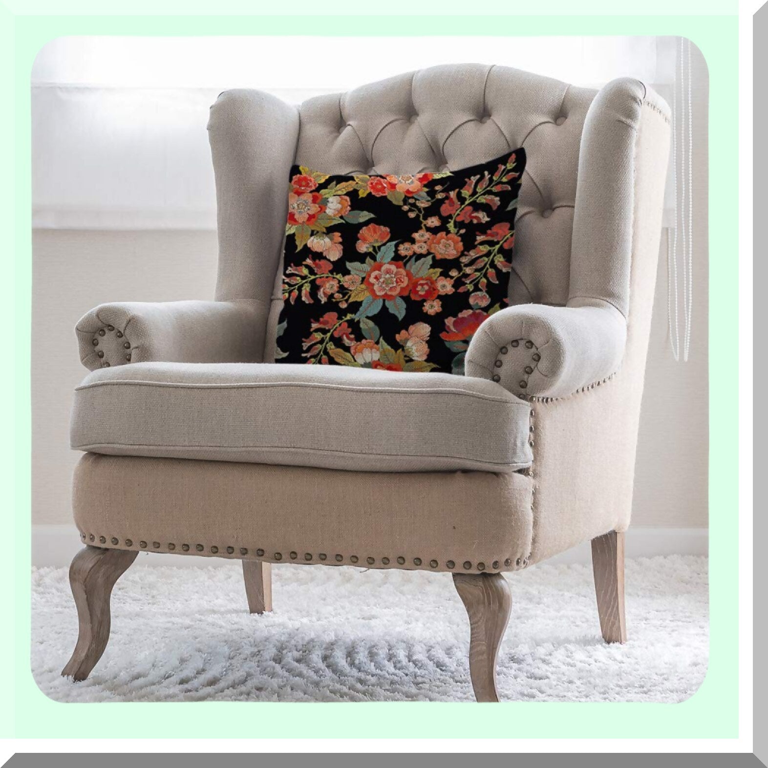 Retro Floral Leaf Vintage Pillow Cover - Black Square Cushion Case for Home & Car Decor - Cotton Linen 18x18 Inch - Flower Style