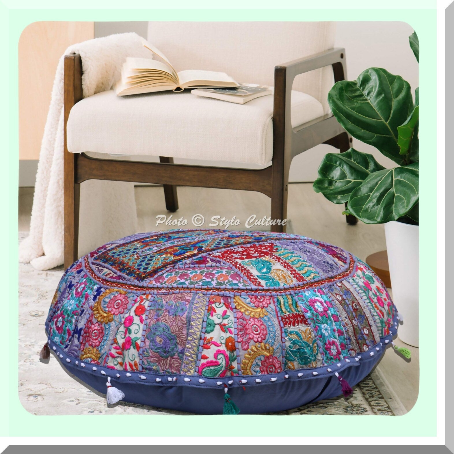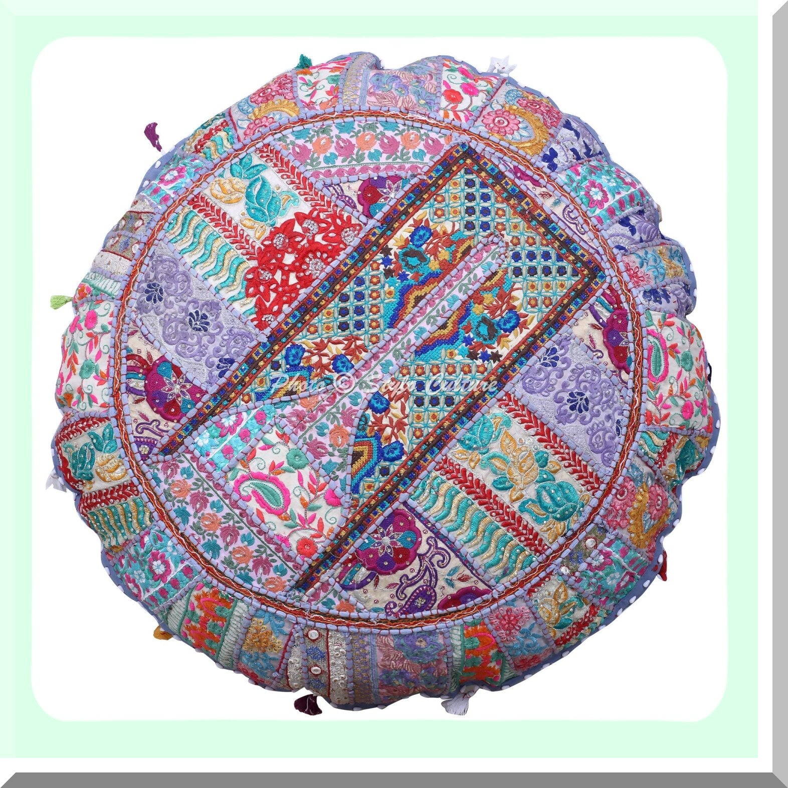 Vintage Patchwork Round Floor Pillow - Grey 32x32 - Ethnic Decorative Seating Cushion - Embroidered Cotton Tuffet Seat Pouf Cover - Footstool Decor - 1 Pc