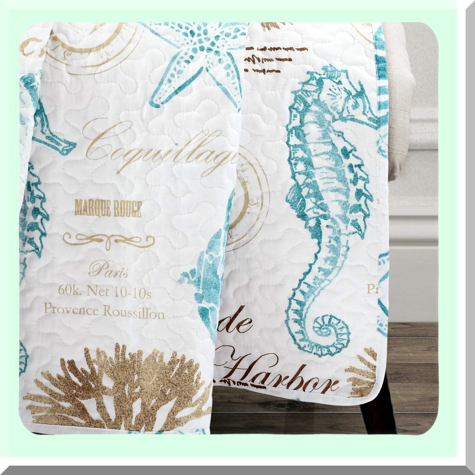 Introducing our Harbor Life Reversible Throw Blanket, the perfect addition to your coastal decor! Featuring a stunning ocean-inspired print with sea life, coral reefs, and beach-themed wording, this blanket adds a calming beachy accent to any room. Flip it over for a classic blue and white striped pattern, offering versatility in style. Crafted from soft microfiber with a cotton/poly blend filling, this quilted nautical blanket is cozy and comfortable. Measuring 50" x 60", it's ideal for single use or snuggling with a loved one. Suitable for all ages, including pets, this blanket is a must-have for all your cozy moments. Easy to care for, simply machine wash cold and tumble dry low. Elevate your space with our Harbor Life Reversible Throw Blanket today!