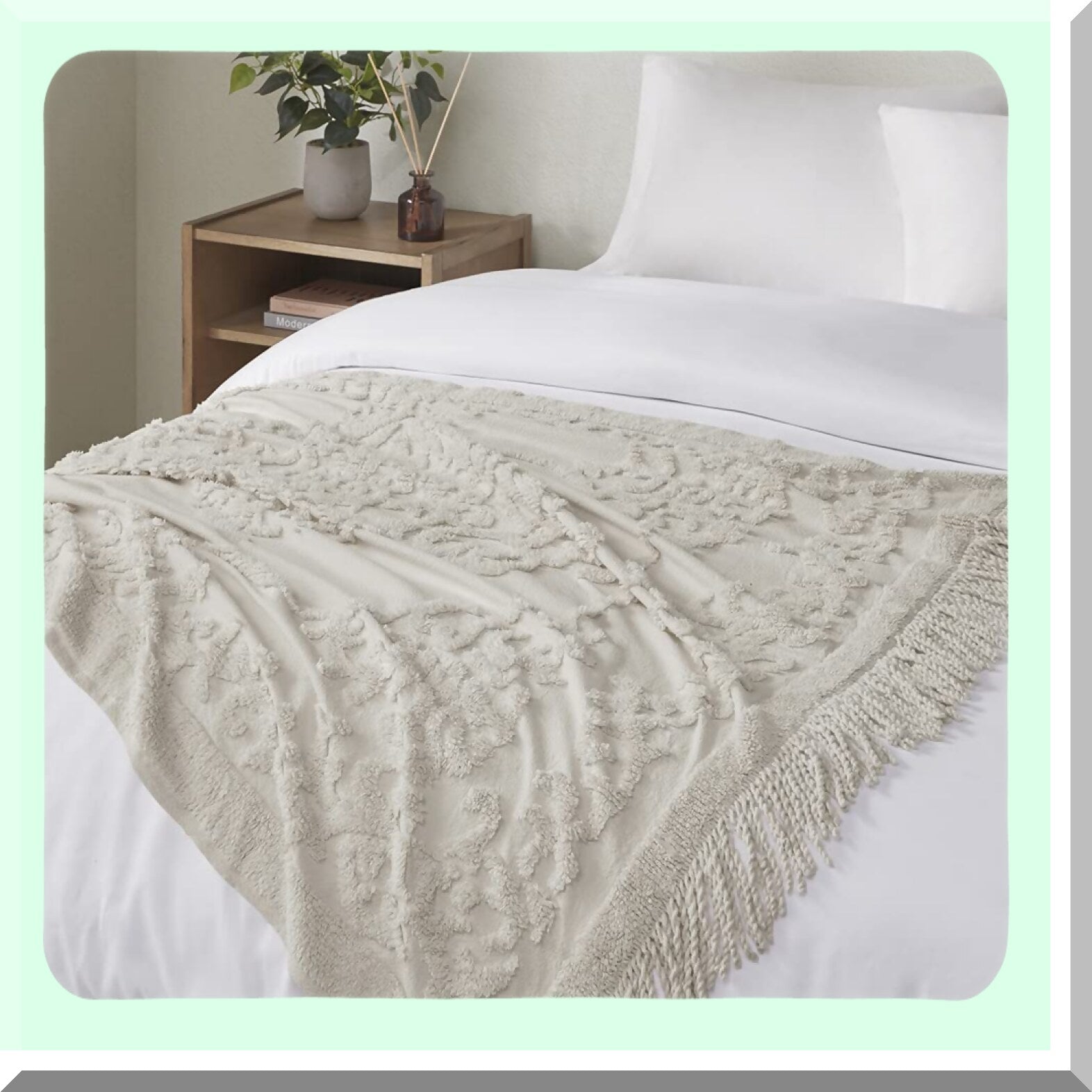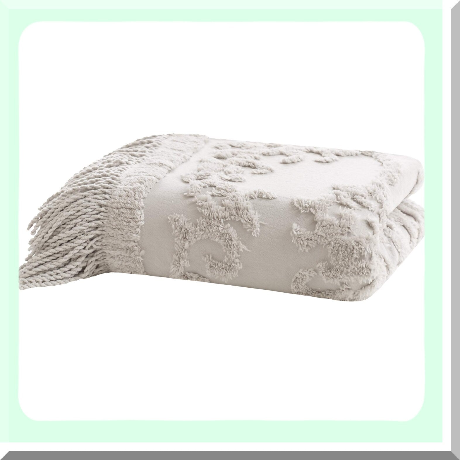 Indulge in luxury with the Chloe Cotton Tufted Throw, a stunning addition to your decor. The elegant tufted chenille design and 4-inch fringe give off a beautiful bohemian vibe, perfect for adding a touch of sophistication to any room. Made from ultra-soft 100% cotton, this throw provides a light and natural feel that is ideal for all seasons. Whether you're layering it on your bed for a stylish look or snuggling up with it to stay warm and cozy, this machine washable throw is a versatile and practical choice. Elevate your space with the Chloe Cotton Tufted Throw and enjoy the ultimate in comfort and style.