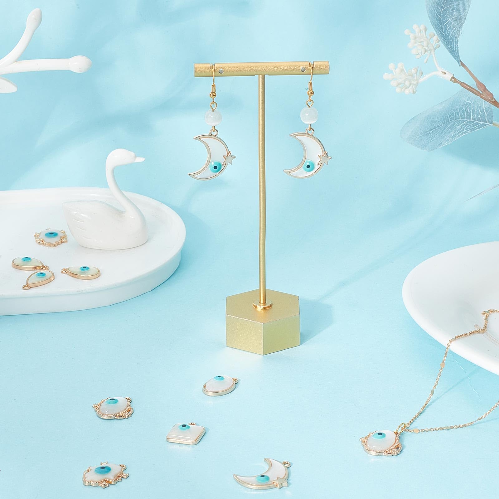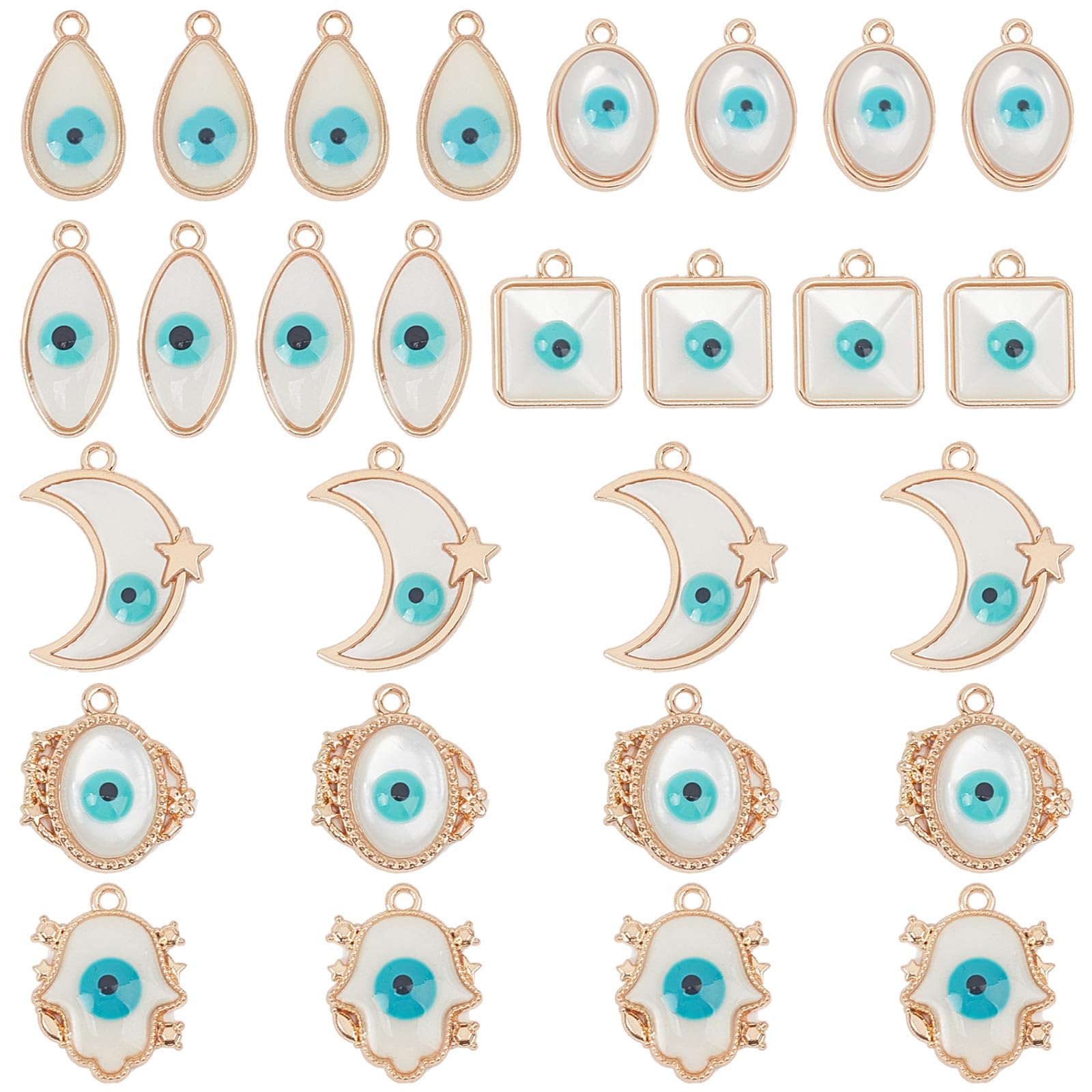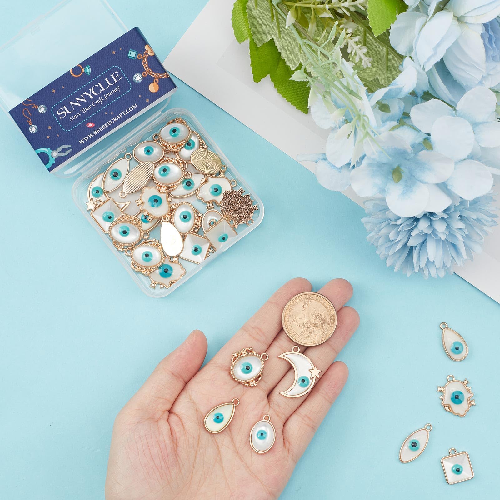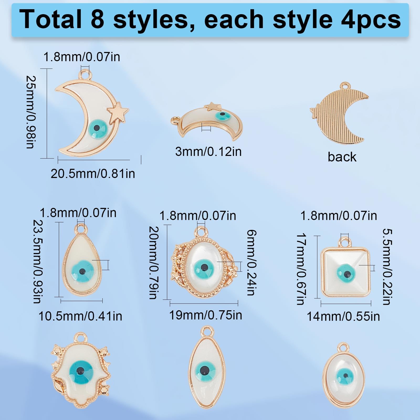 This set includes 32 white resin charms in 8 different styles, with four pieces of each style. The charms feature various designs, including butterfly, oval, heart, and eye shapes, with a vivid white and blue color scheme that adds a mysterious touch. The largest butterfly charm measures 19x26x3mm, while the smallest square charm is 17x14x6mm, with hole sizes suitable for jewelry making. Made from durable resin and alloy, these charms are sturdy and resistant to fading, ensuring long-lasting use. Ideal for creating personalized jewelry such as earrings, necklaces, bracelets, and keychains, they are also suitable for decorating gifts or crafts for holidays like Halloween, Thanksgiving, and birthdays. All charms are stored in a convenient plastic box for easy organization. Perfect for craft enthusiasts, these versatile charms provide a wide range of options for DIY jewelry and accessory projects.