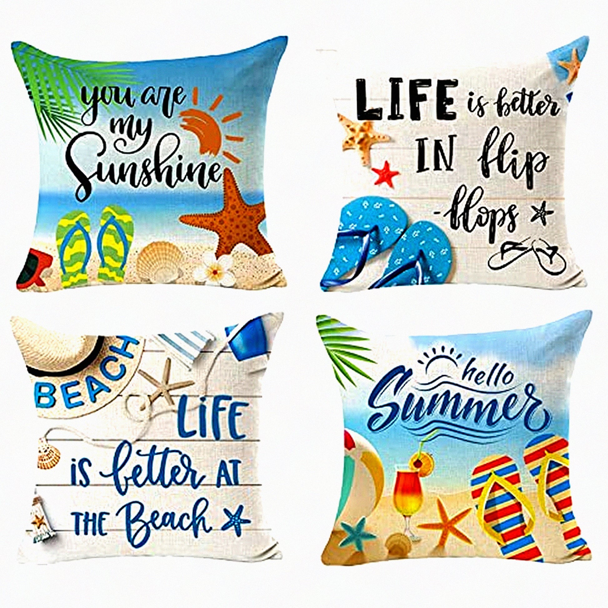 Beach Life Sunshine Flip Flops Pillow Cover - Summer Gift Set of 4 Decorative Cushion Covers for Bed Sofa 18"x 18" - Cotton Linen Square Waist Case