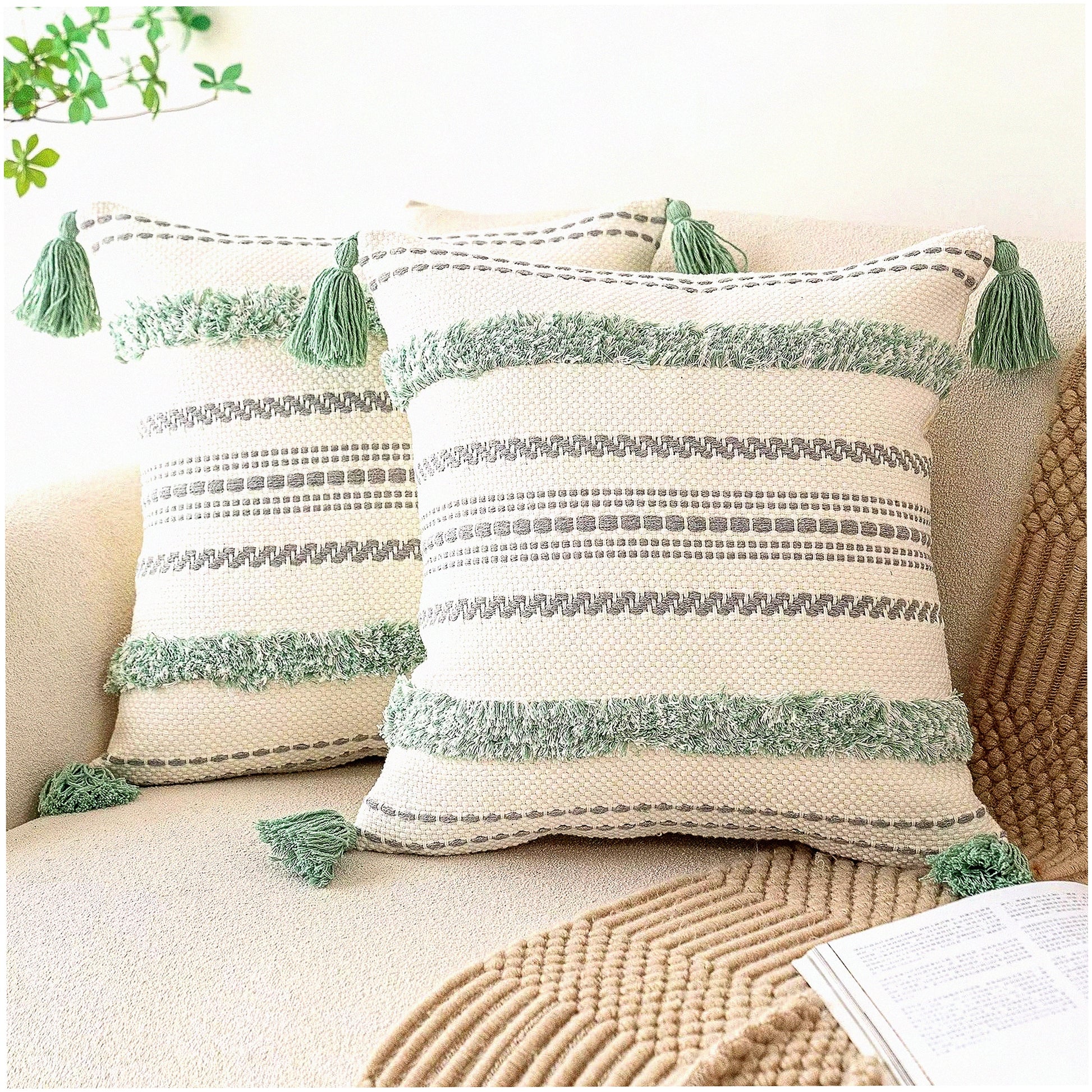 Tufted Farmhouse Striped Pillow Covers - Set of 2 Woven Boho Cushion Cases for Couch & Bed, Textured Neutral Decorative Pillowcase 18x18 Light Green