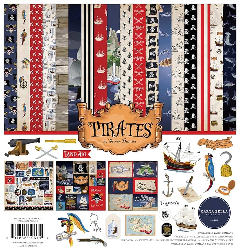 This collection kit features a variety of 12-inch by 12-inch papers with pirate-themed designs. The patterns include images of ships, treasure chests, maps, and nautical elements, all suitable for crafting projects related to pirates and adventure. The set provides a range of coordinating patterns and colors to help create detailed layouts, cards, and other paper crafts. The designs are vibrant and detailed, making it easy to add a thematic touch to your creative projects.