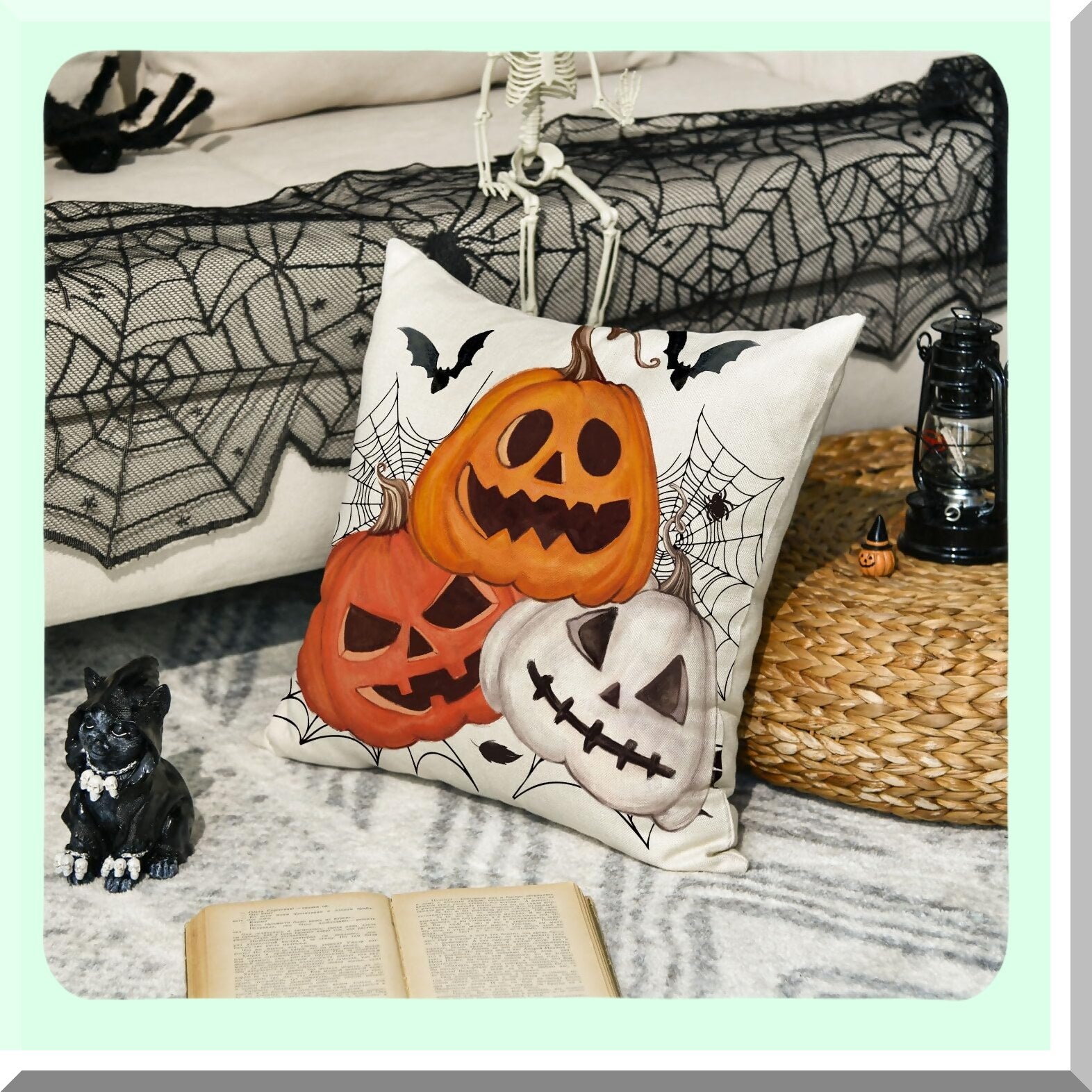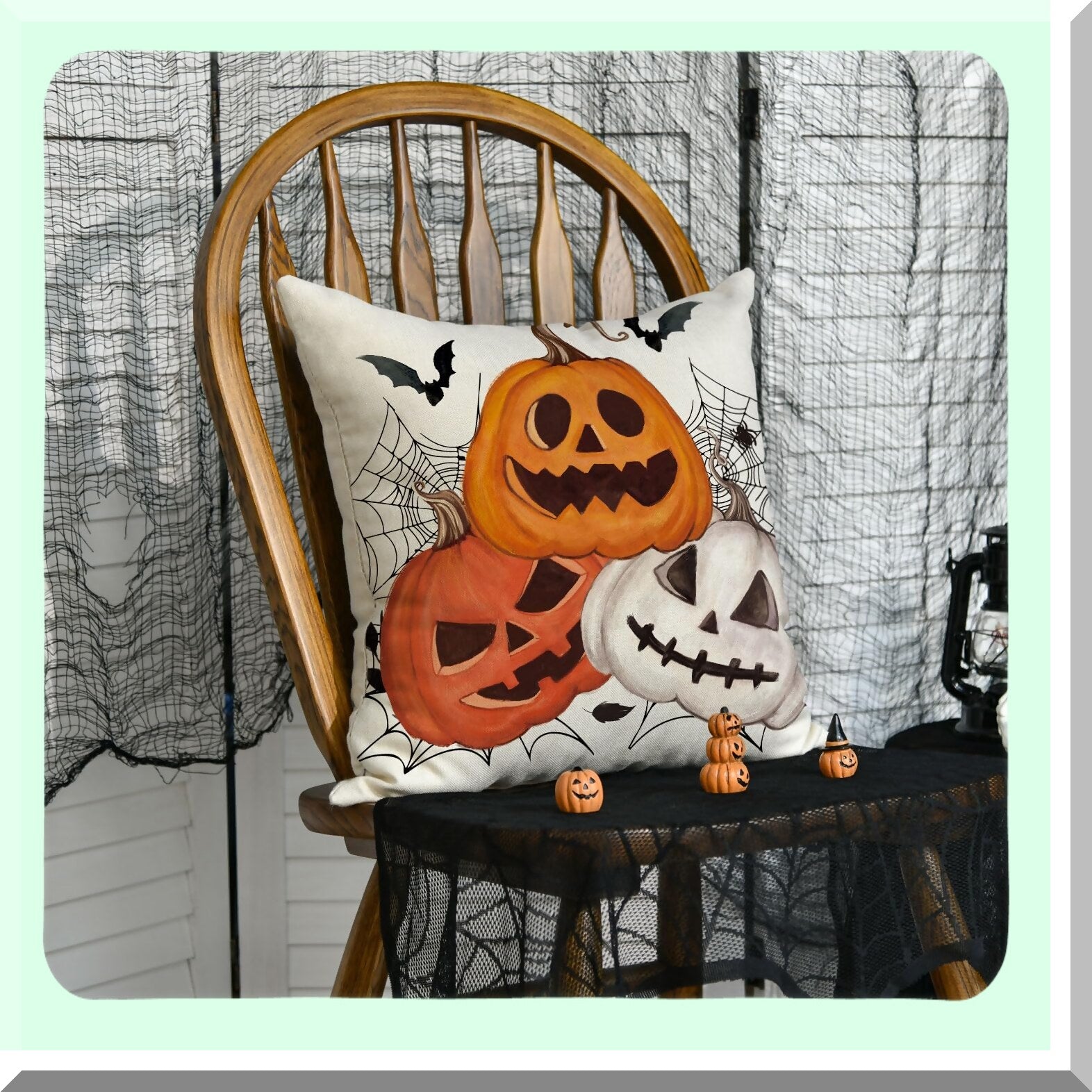 Spooky Halloween Pumpkin Bat Throw Pillow Cover - 18x18 Inch Farmhouse Cushion Case for Sofa Couch - Holiday Decoration