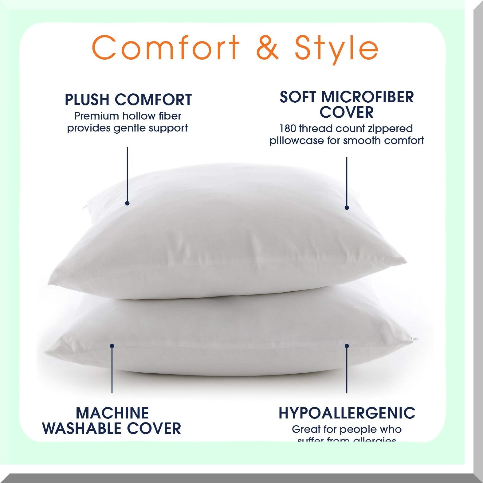Two 20x20 throw pillows are generously stuffed with firm yet plush hypoallergenic filling, making them versatile for use as sleeping pillows or decorative throw pillows. The hypoallergenic, machine-washable pillowcase offers ultra-soft comfort and prevents dust, pollen, and other household allergens from collecting on the pillow. These pillows are designed for sleeping or use with 20x20 inch pillow shams, making them perfect for any area in your home.