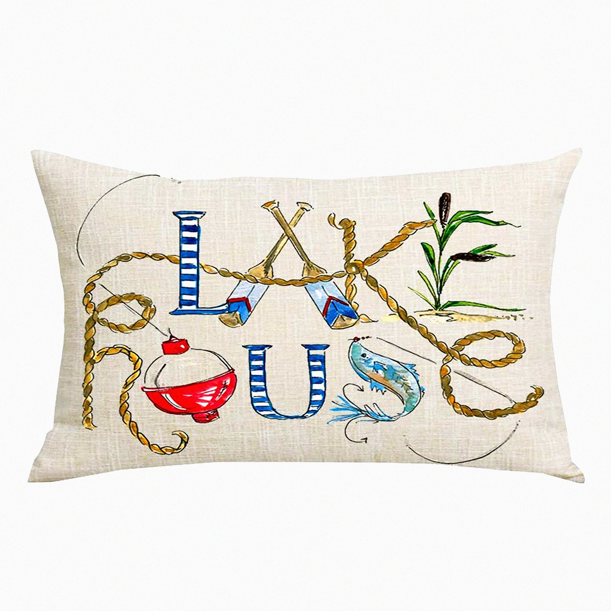 Blue Lake House Watercolor Decorative Pillowcase - Summer Home Sofa Chair Bed Decoration - Cotton Linen Throw Pillow Cover - 12 x 20 Inches
