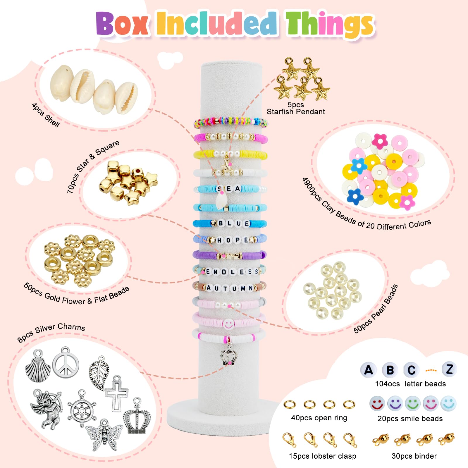 This colorful beads jewelry making kit offers a versatile selection of polymer clay beads suitable for creating bracelets, necklaces, earrings, keychains, and phone pendants. The kit includes 4,900 vibrant beads, such as flat round beads, alphabet beads (A-Z), pearl beads, star beads, spacer beads, jump rings, crimp beads, flat flower beads, smiley face beads, shell beads, starfish pendants, and more. It also features elastic cords, a small scissors, and a storage box with 24 compartments to keep beads organized. Made from lightweight, waterproof, and safe polymer clay, these beads are comfortable to wear and ideal for both adults and teens. This DIY jewelry kit encourages creativity, enhances fine motor skills, and fosters bonding between parents and children. Perfect for making personalized accessories, it makes a thoughtful gift for birthdays, holidays, or special occasions. Suitable for various craft projects, it provides endless possibilities for unique jewelry designs.