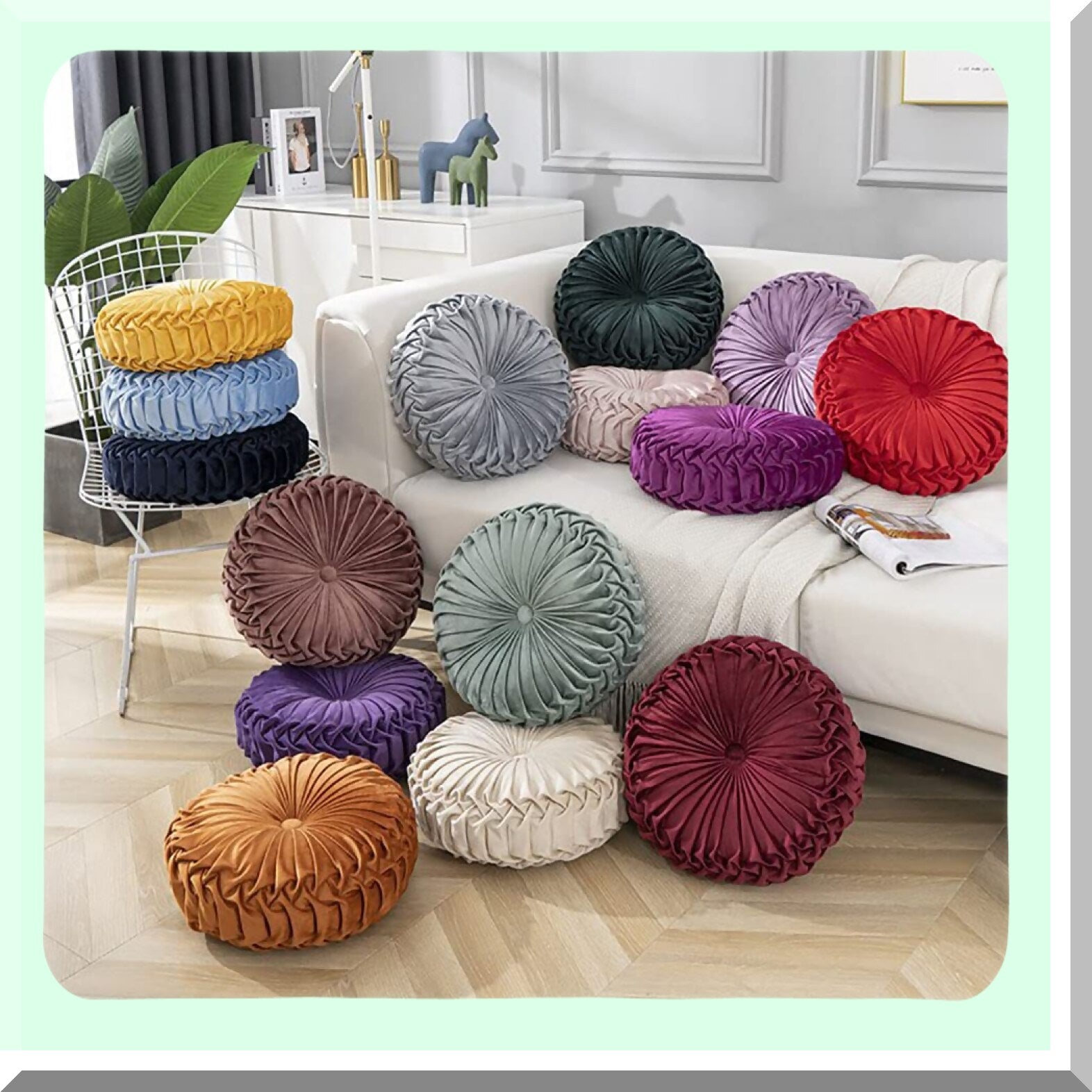 The round cushion, made with a polyester (PP cotton) filling and a velvet fabric cover, offers several practical benefits. It is soft and has good elasticity, ensuring comfort and durability. The velvet fabric cover provides an attractive sheen, enhancing its aesthetic appeal.