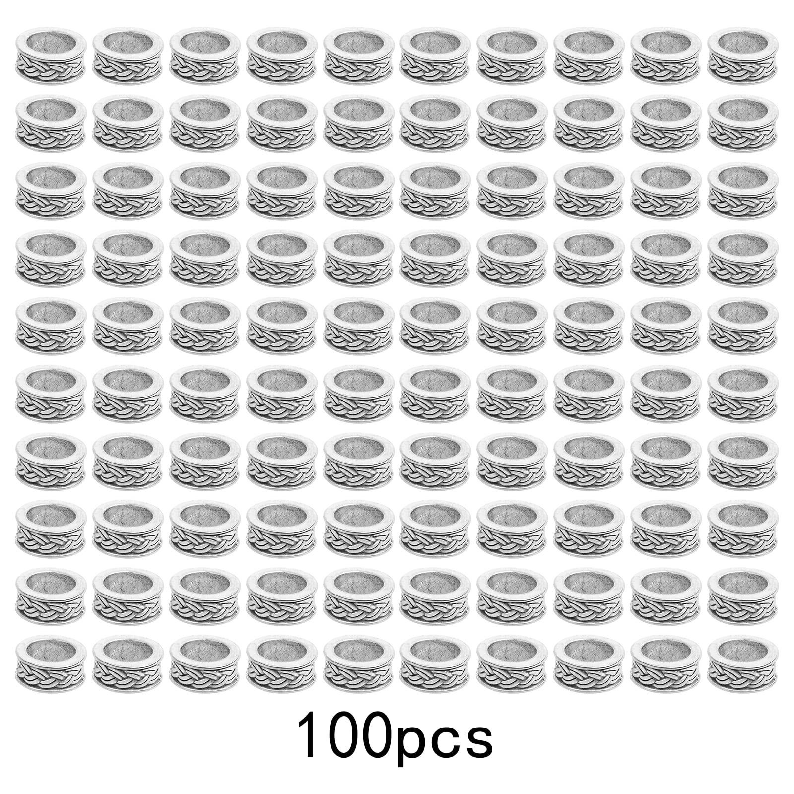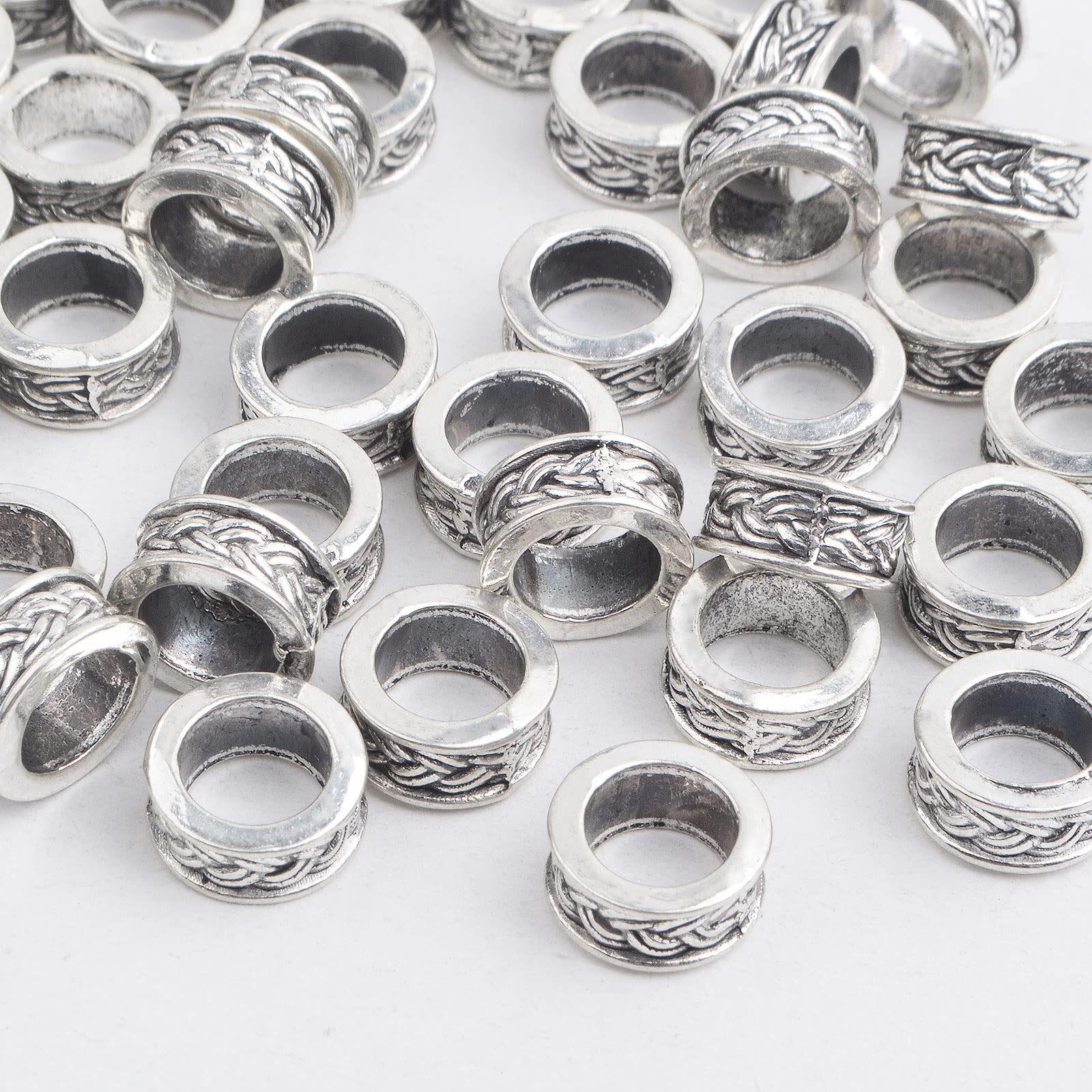These antique silver rondelle spacer beads are made from durable alloy material, featuring a classic silver finish. Each bead measures approximately 9 mm in diameter with a 6.5 mm hole, suitable for stringing with various materials such as chains, leather laces, fabric strips, and cords. The large hole design allows for easy threading of thicker materials, making them versatile for different jewelry projects. The package includes 100 beads, providing ample supply for multiple creations or sharing with others. These spacer beads are lead-free and cadmium-free, ensuring safe use in jewelry making. Their vintage silver appearance adds a sophisticated touch to designs, perfect for creating European-style charm bracelets, necklaces, wristbands, and other craft projects. Ideal for DIY jewelry, art designs, and collecting, these beads can help craft unique accessories suitable for everyday wear or special occasions. Their elegant design enhances the overall aesthetic of various jewelry styles and craft endeavors.