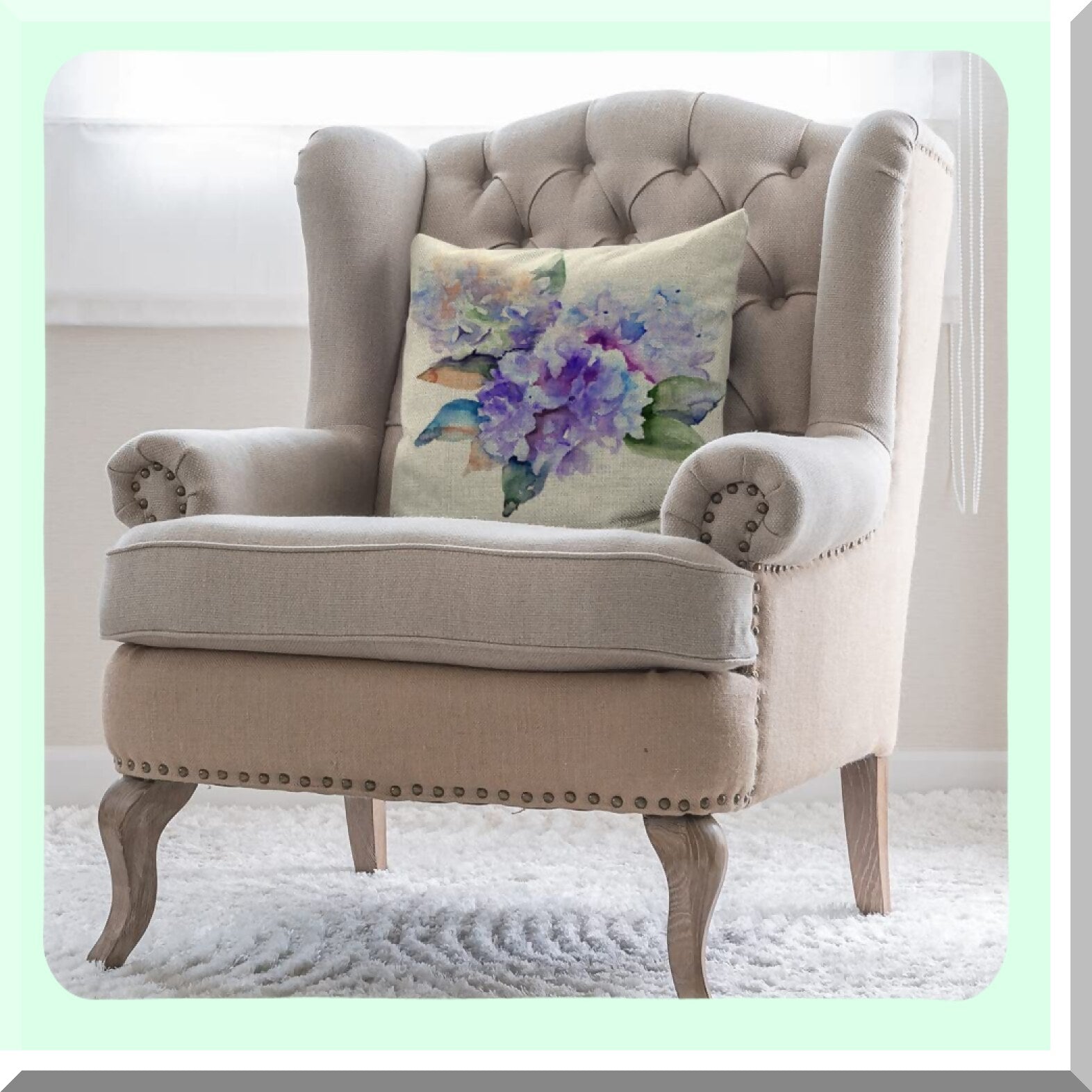 The throw pillow cover, sized 18"x18", features a hydrangea blue watercolor blossom design. Made from a cotton-linen blend, it offers a soft and durable texture suitable for various settings such as home, office, and school. The cover is versatile, appealing to men, women, boys, and girls, enhancing the aesthetic of any space. Its practical benefits include easy maintenance and the ability to refresh the look of a room effortlessly.
