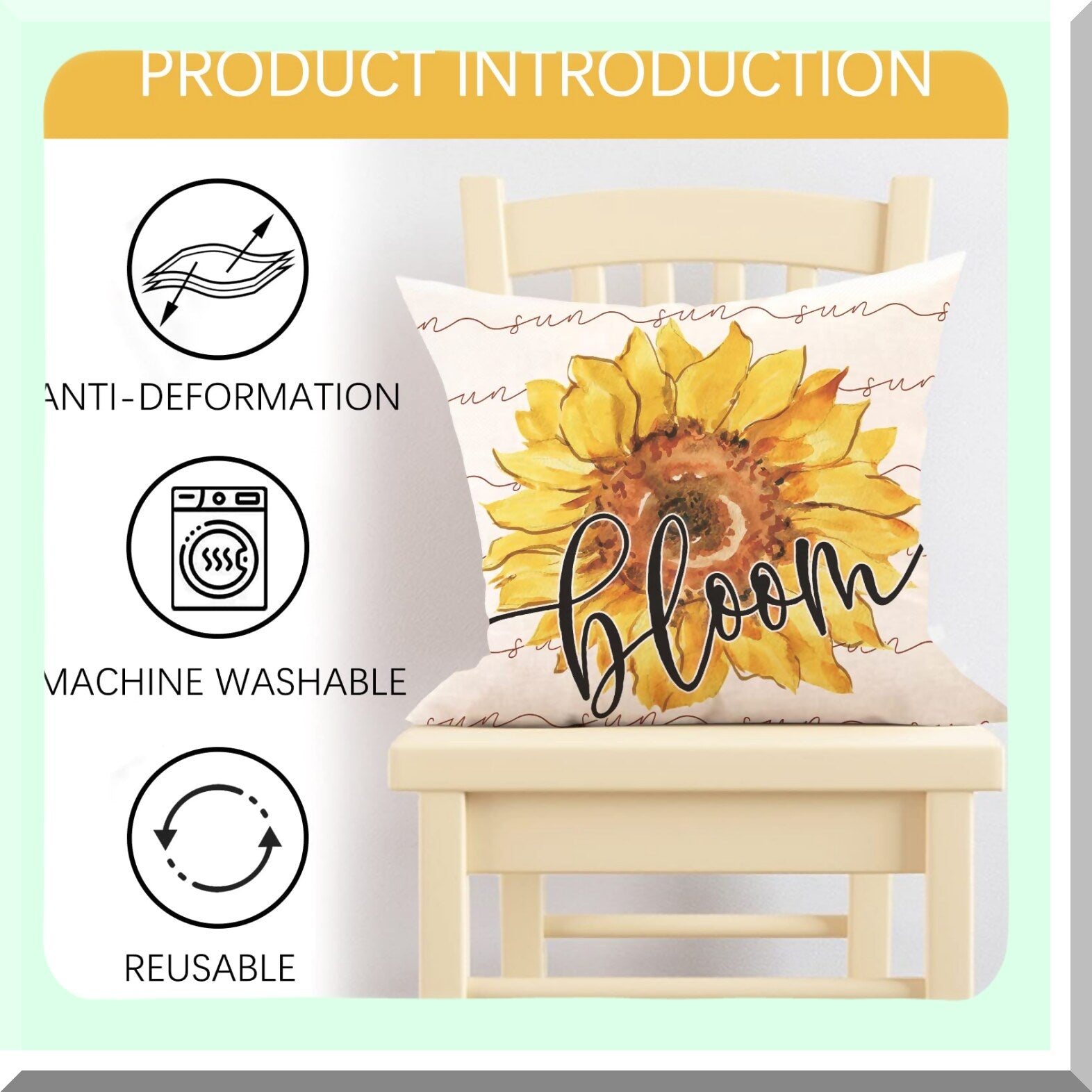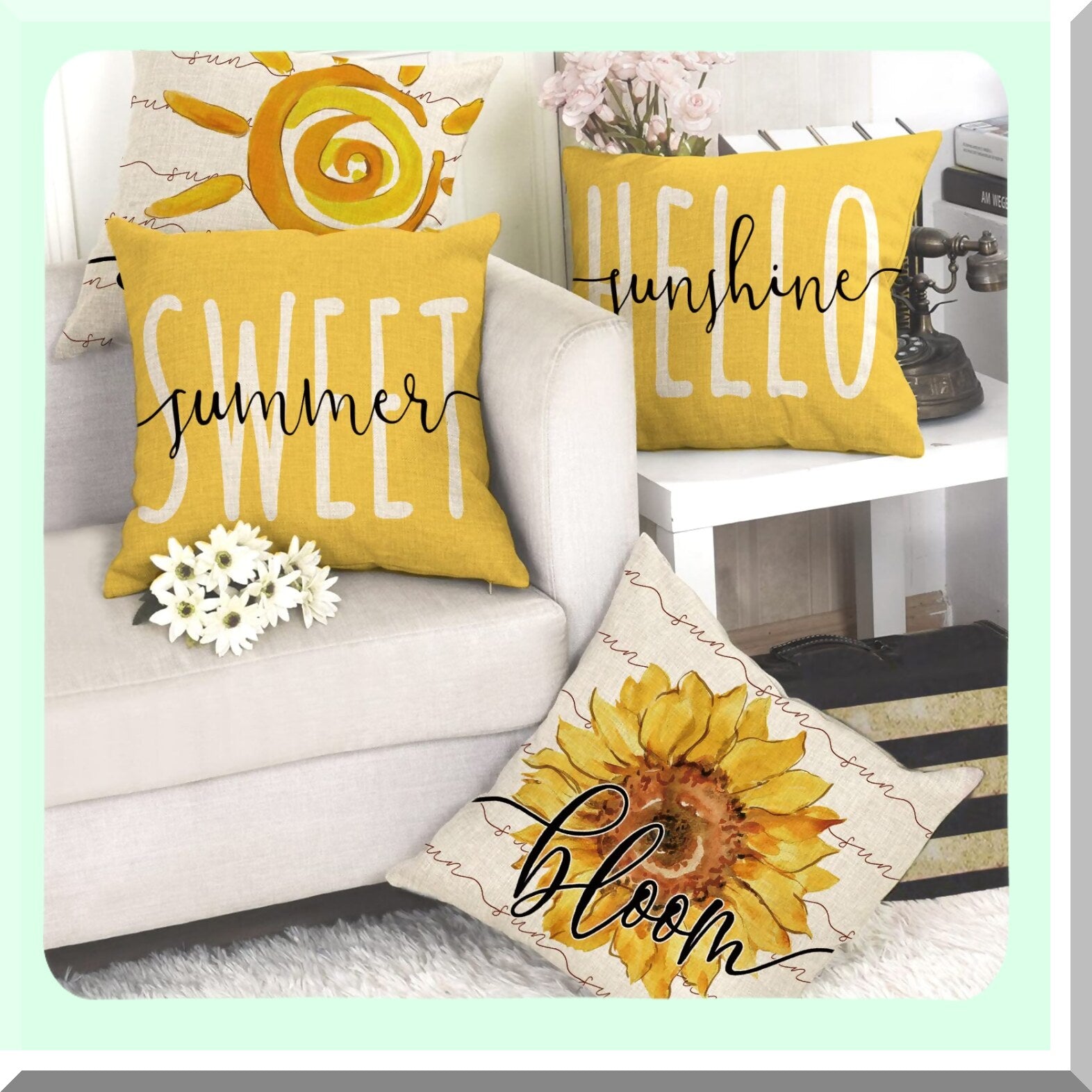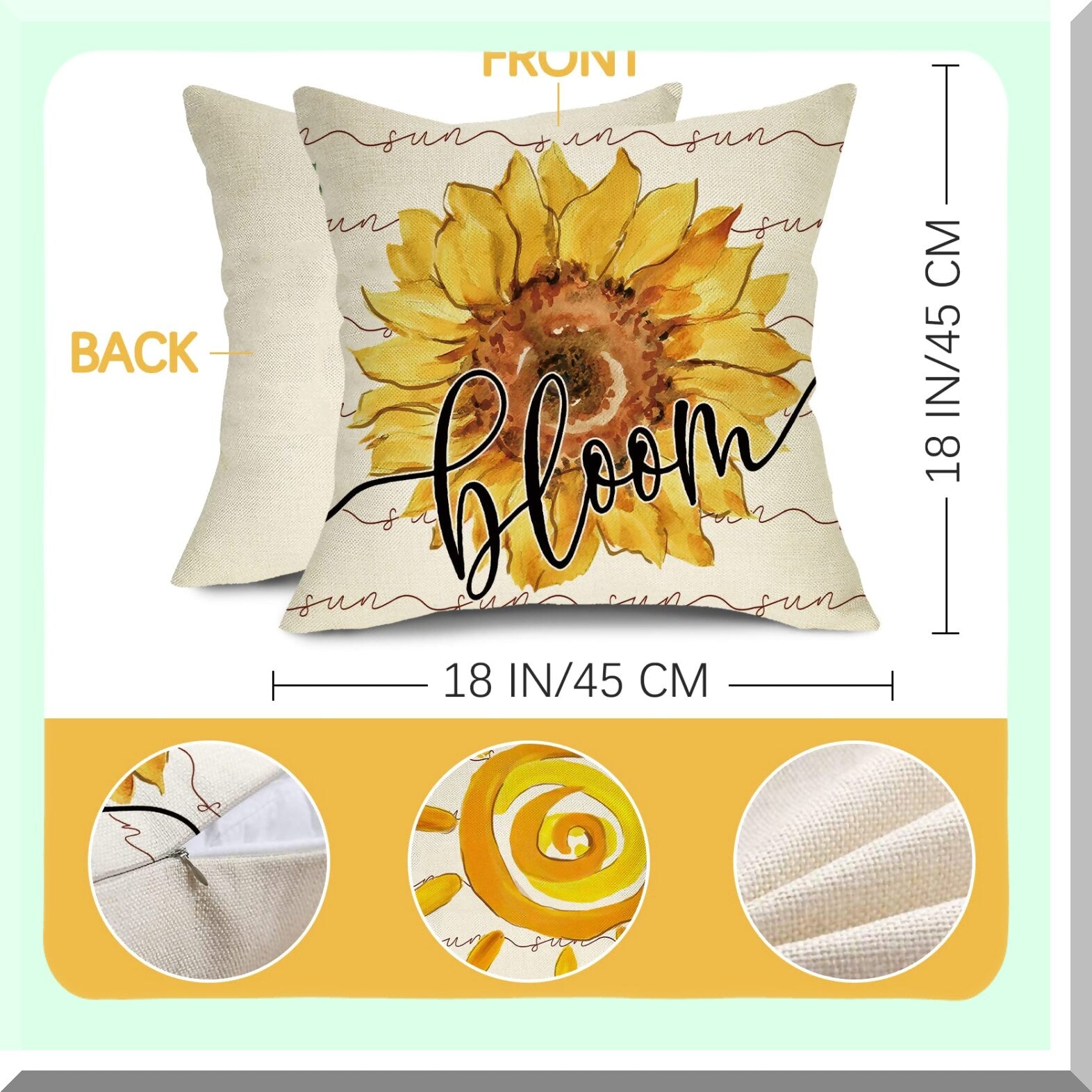 Sunflower Sunshine Decorative Pillow Cover Set - Seasonal Farmhouse Outdoor Home Decor - Sweet Summer Bloom Couch Cushion Case - Yellow Flower Porch Throw Pillow 18x18, Set of 4