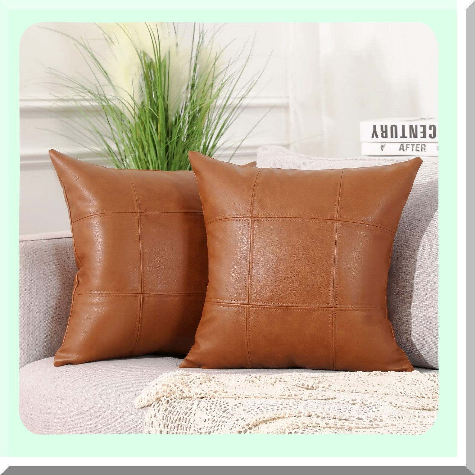 Luxury Plaid Vegan Leather Pillow Covers - Set of 2 Modern Hand Stitched Decorative Cushion Cases for Couch Sofa Bed Farmhouse, Outdoor Pillowcases 18x18 Inches Brown