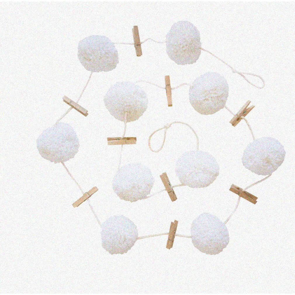 Enhance your space with this 6ft yarn pom pom garland featuring large 2.5 inch pom poms in a clean white color. The minimalist design adds a touch of boho charm, making it a versatile decorative piece suitable for various settings. The garland includes clothespins, allowing for easy display of photos, cards, or small decorations. Its simple yet stylish appearance complements many interior styles, providing a fresh and airy feel. Ideal for decorating walls, mantels, or event spaces, this garland offers a charming way to brighten any room. Its length and design make it suitable for both casual and more refined decor, whether for everyday use or special occasions. Easy to hang and arrange, it adds a playful and elegant touch to your home or event decor collection.