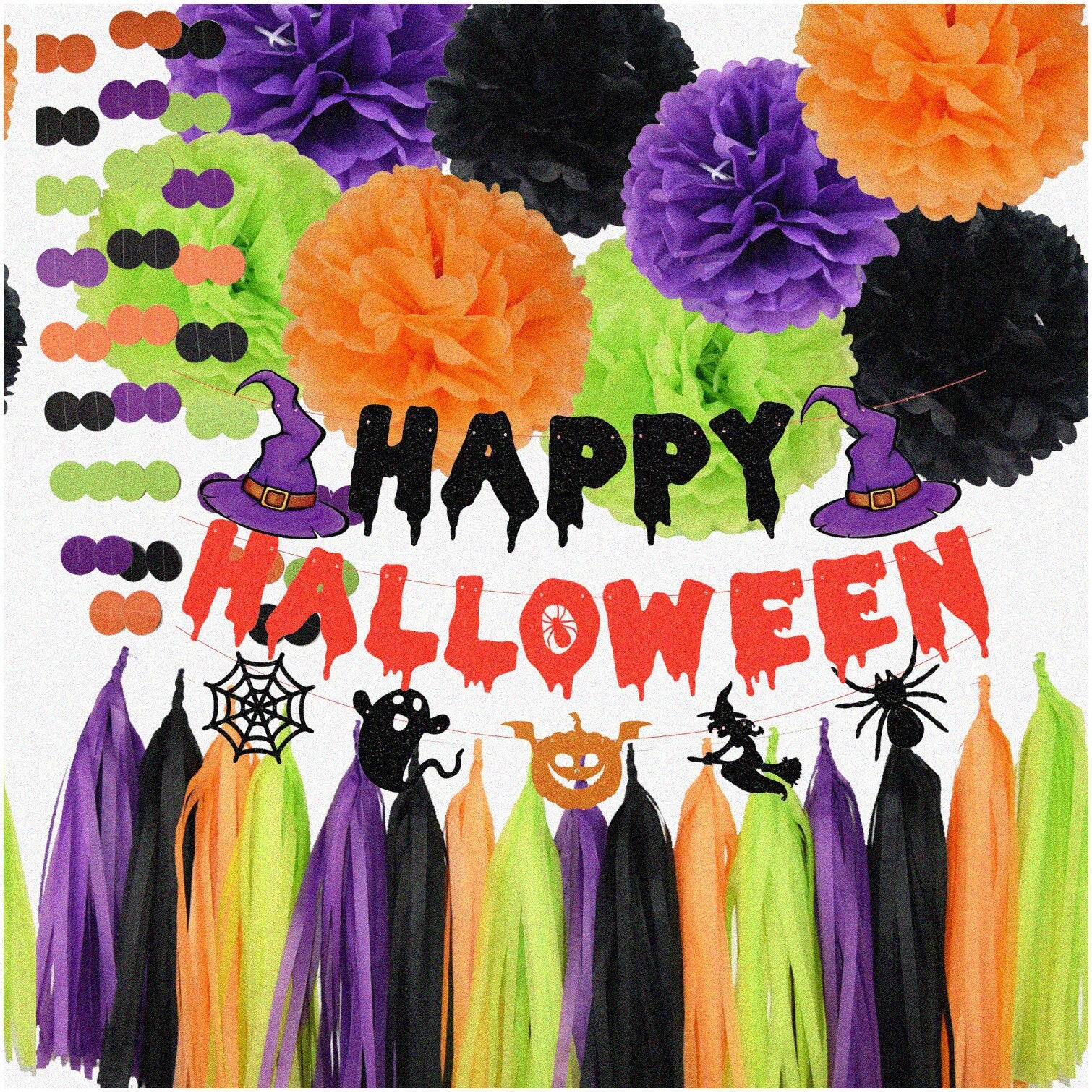 Create a festive atmosphere with this Halloween party decoration package. It includes a vibrant "Happy Halloween" banner to set the mood. Colorful tissue paper flowers in green, black, orange, and purple add a touch of elegance and appear to float, enhancing the cheerful ambiance. The set also features tissue paper tassels in mixed colors, a white ribbon, and easy-to-follow instructions for quick setup. Additionally, there are circle dot paper garlands in orange, black, green, and purple, each approximately 6.5 feet long, perfect for decorating homes, classrooms, offices, or outdoor spaces. Whether for a Halloween celebration, trunk or treat, or other festive event, this decoration kit provides everything needed to impress guests and create a lively, spooky environment. Durable and easy to assemble, these decorations are ideal for adding a fun, colorful touch to any Halloween occasion.