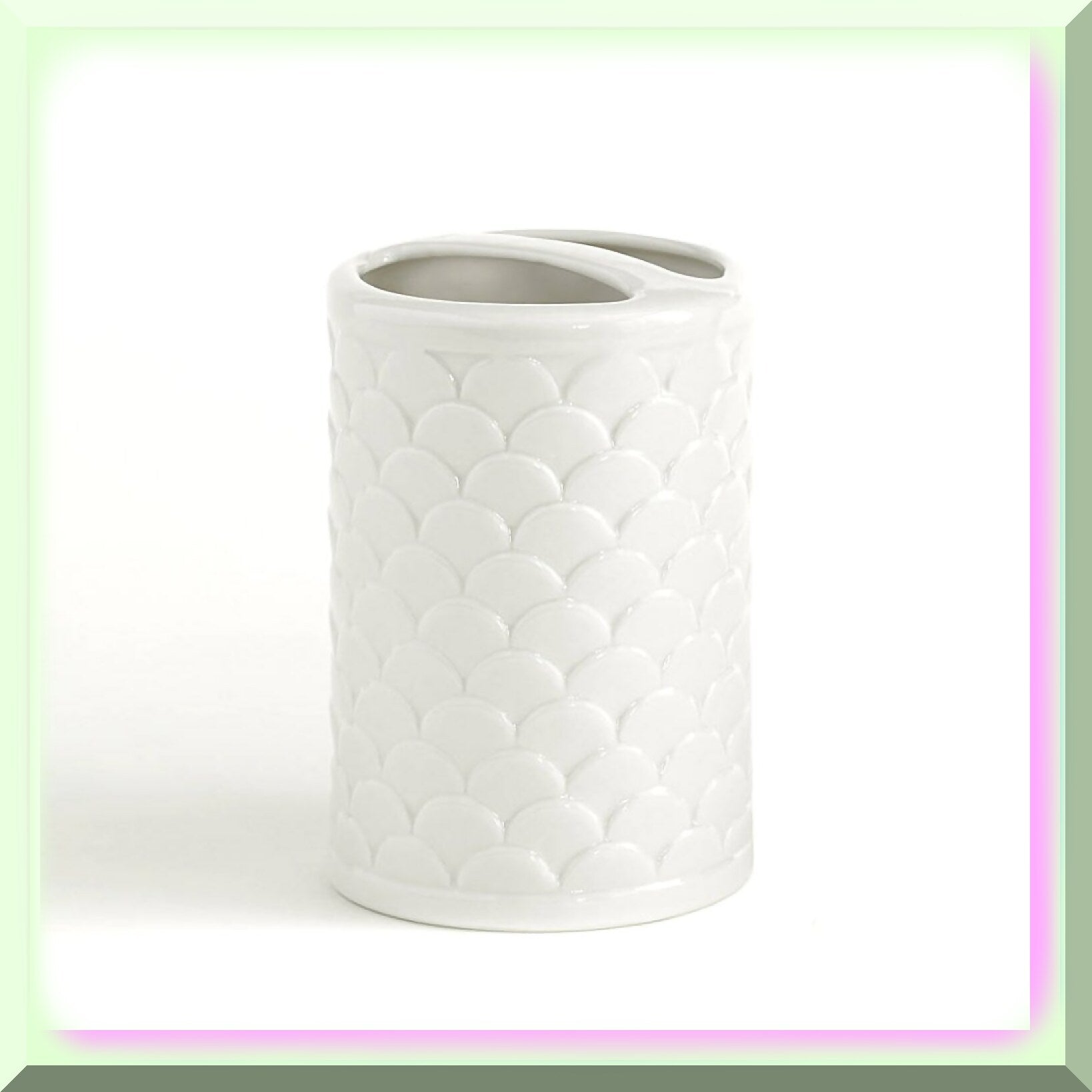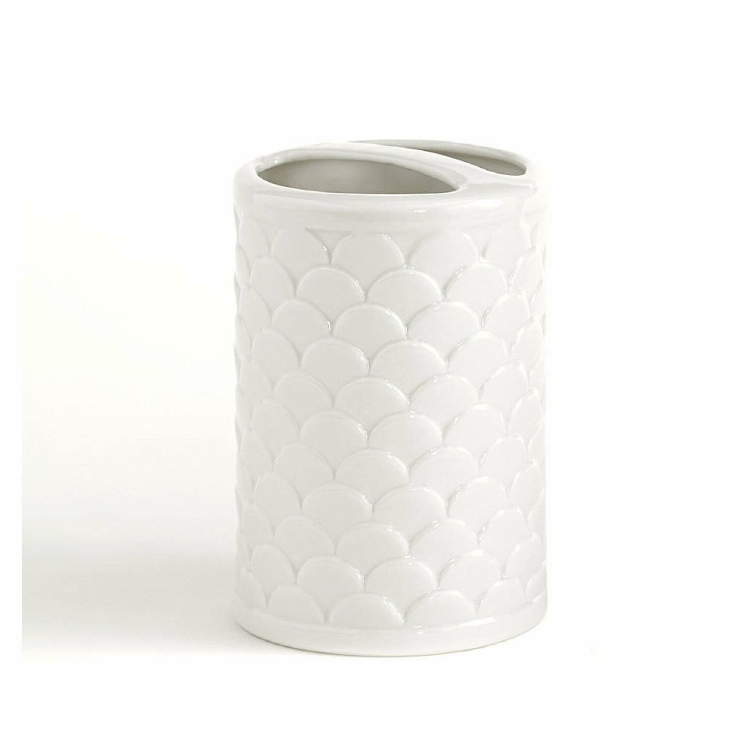 This toothbrush holder is crafted from finely embossed porcelain, featuring elegant scale patterns that evoke an aquatic-inspired style. Its compact design measures 2.83 inches in diameter and 4.13 inches in height, making it suitable for bathroom countertops. The embossed porcelain construction adds a touch of sophistication and texture. Designed for durability and aesthetic appeal, this accessory complements other bath essentials with its refined pattern. It is easy to clean, requiring only hand washing with mild soap to maintain its appearance. The toothbrush holder is part of a collection that includes a lotion dispenser, tumbler, soap dish, tray, cotton jar, tissue holder, and waste basket, all sharing the same embossed porcelain design. Perfect for adding a subtle, elegant touch to your bathroom decor, this piece combines functionality with timeless style.