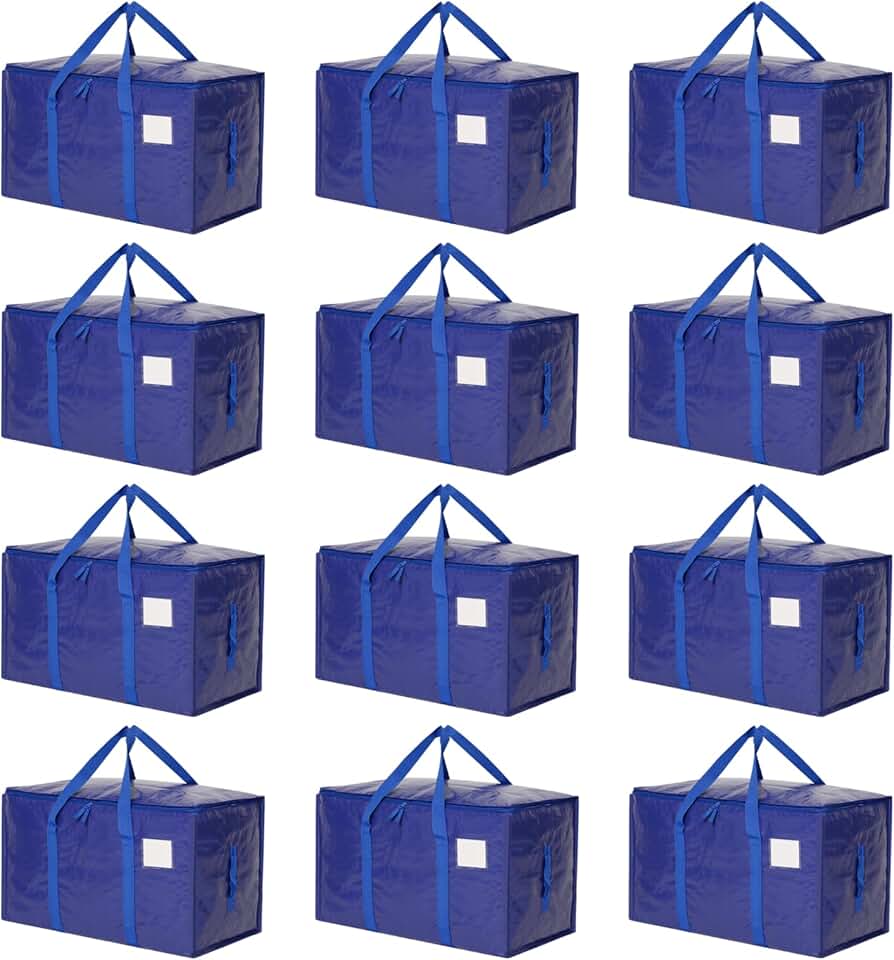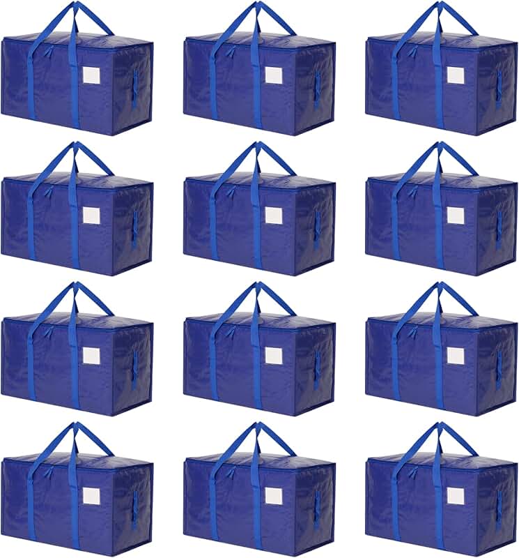 This set includes 12 large, durable moving bags designed for heavy-duty use. Made from sturdy plastic, these extra-large storage totes are ideal for packing and transporting a variety of household items. The blue storage bins feature secure lids to keep contents safe and organized during moving or storage. Each tote is equipped with handles and zippers, making it easy to carry and access belongings. These versatile storage bags are suitable for clothes, linens, and other household items, providing a convenient solution for decluttering or relocating. The robust construction ensures long-lasting use, while the spacious design helps maximize packing efficiency. Perfect for organizing your home or office, these plastic totes offer a reliable and practical option for managing your belongings during any move or storage need.