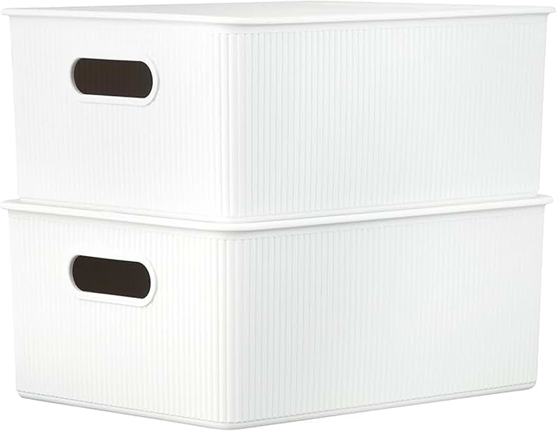 The Superio Decorative Plastic Lidded Home Storage Bins are designed for versatile organization around the home. These large, white storage baskets come in a set of two, each with a 15-liter capacity, providing ample space for storing various household items. The stackable design allows for efficient use of space on closet shelves, drawers, or shelves, helping to keep areas tidy and organized. Made from durable plastic, these bins feature a ribbed texture that adds a decorative touch while ensuring strength and stability. The lids help protect contents from dust and dirt, making them suitable for storing clothing, accessories, toys, or other household essentials. Their neutral white color complements different interior styles, offering a practical and attractive storage solution. Ideal for maximizing storage in bedrooms, closets, or living spaces, these bins combine functionality with a clean, modern look.