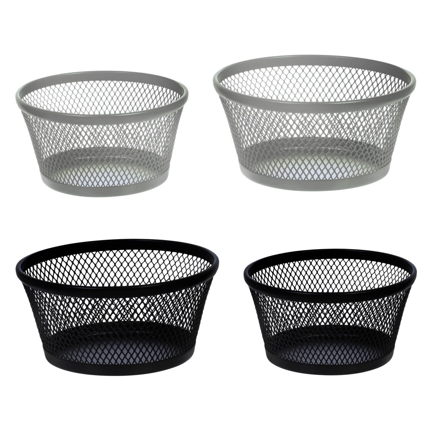 Comes with (Pack of 36). Get organized with sharp-looking metal storage cups! Their sleek, modern design looks great and gives you a place to organize small office supplies like tacks, rubber bands, keys, paper clips & more. Storage cups come assorted between black and silver finishes and between 2 sizes: 3.5x2-in. & 4.5x2-in.