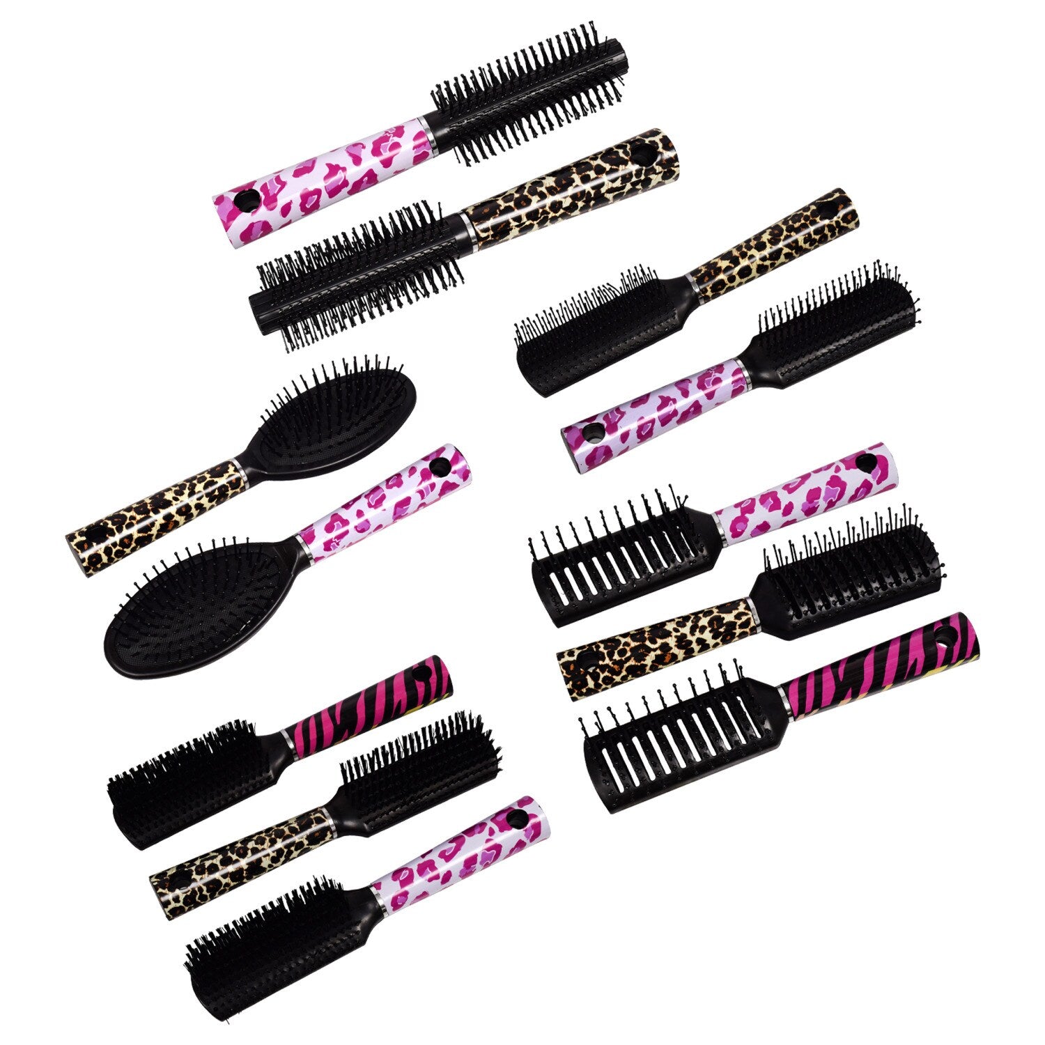 Comes with (Pack of 24). An assortment of brushes to meet all of your beauty needs! Each case is assorted among four styles, and each animal print brush has plastic bristles with smooth, rounded tips to protect hair and scalp while brushing and styling.