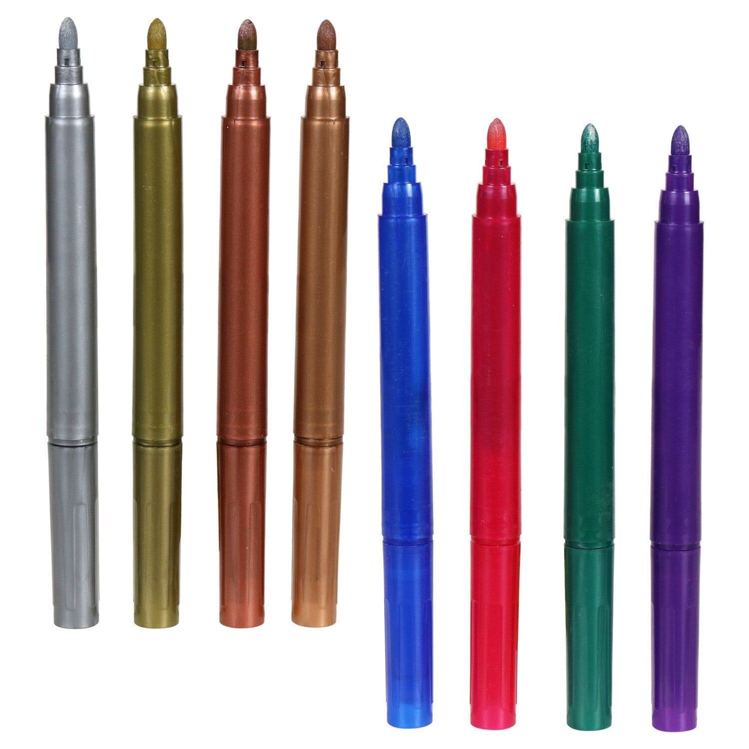 Comes with (Pack of 48). A must-have addition to school supplies! Fine-tip markers in a variety of metallic colors are great for drawing, outlining, and tracing. Perfect for crafts, schools and day care centers, care packages, churches, travel, and leaving notes. Jot(R) Metallic All-Purpose Markers come assorted between colors packs of silver, gold, bronze, and rose gold, and packs with blue, red, green, and purple.