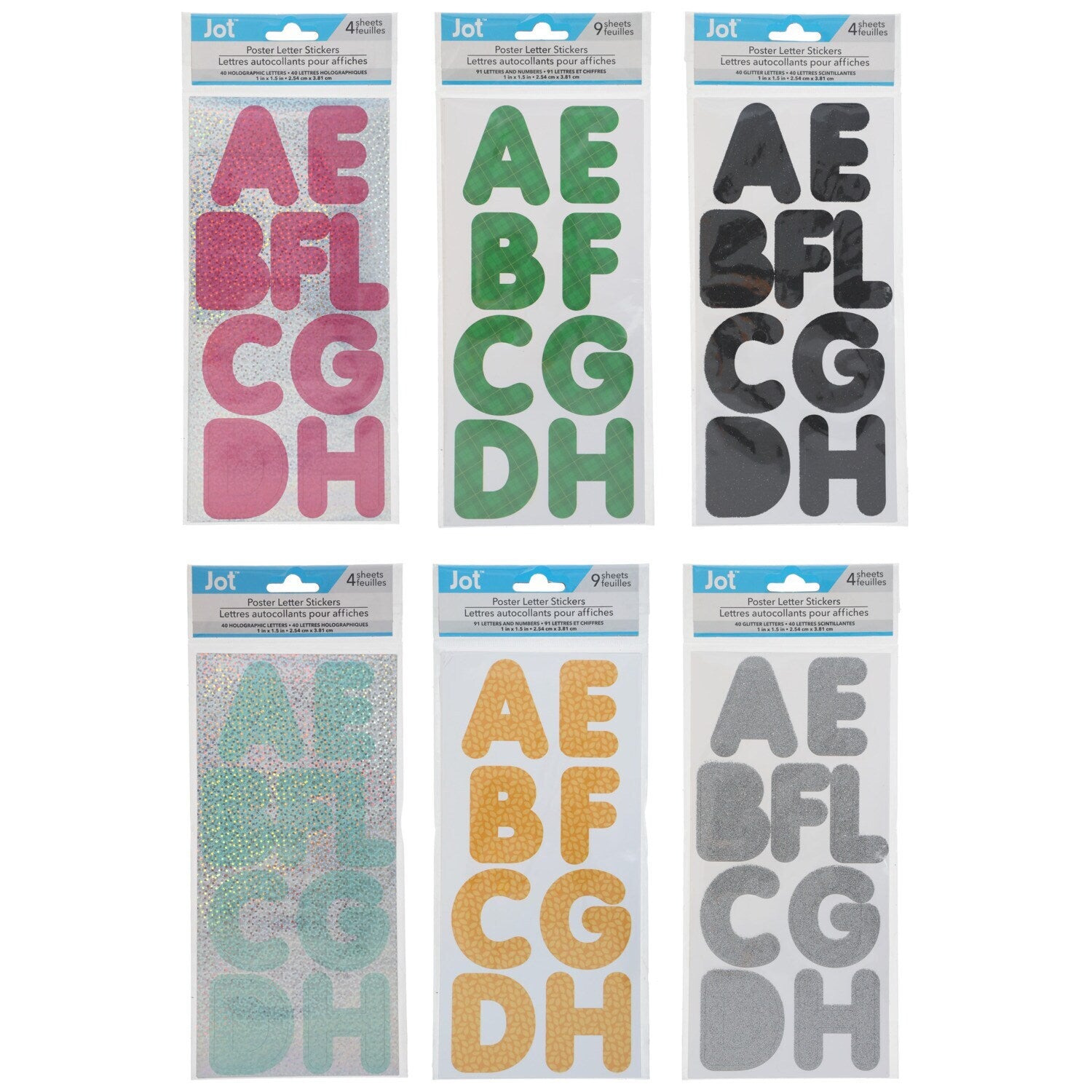 Comes with (Pack of 36). Add polish to your posters, bulletin boards, and classroom walls with vibrant poster letter stickers! Assorted among various finishes, each pack contains 4 or 9 sheets of self-adhesive capital letters. Great for schools, camps, churches, crafters, and more. Jot™ Poster Letter Stickers come assorted among 6 different packs: 4-sheet packs of blue glitter finish, 4-sheet packs of green laser finish, 4-sheet packs of silver glitter finish, 4-sheet packs of purple laser finish, 9-ct. packs of matte orange-patterned finish, and 9-ct. packs of matte pink-patterned finish. Assortment may vary.