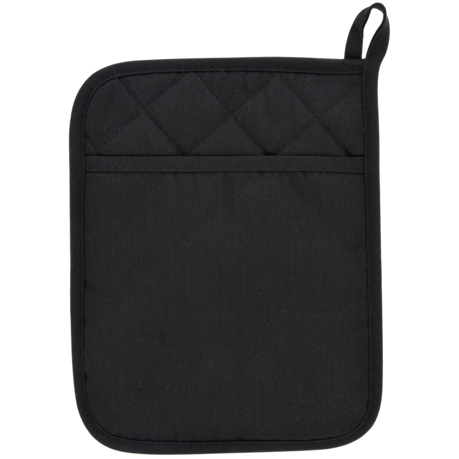 Comes with (Pack of 24). Keep your hands and counters safe from high cooking temperatures with these sleek Home Collection™ Black Polyester/Rubber Pot Holders. These 9x7-in. pot holders are composed of polyester and cotton with a 100% rubber back for added safety and durability. Each pot holder features a convenient loop for easy storage. Perfect for baking, outdoor grilling, and more!