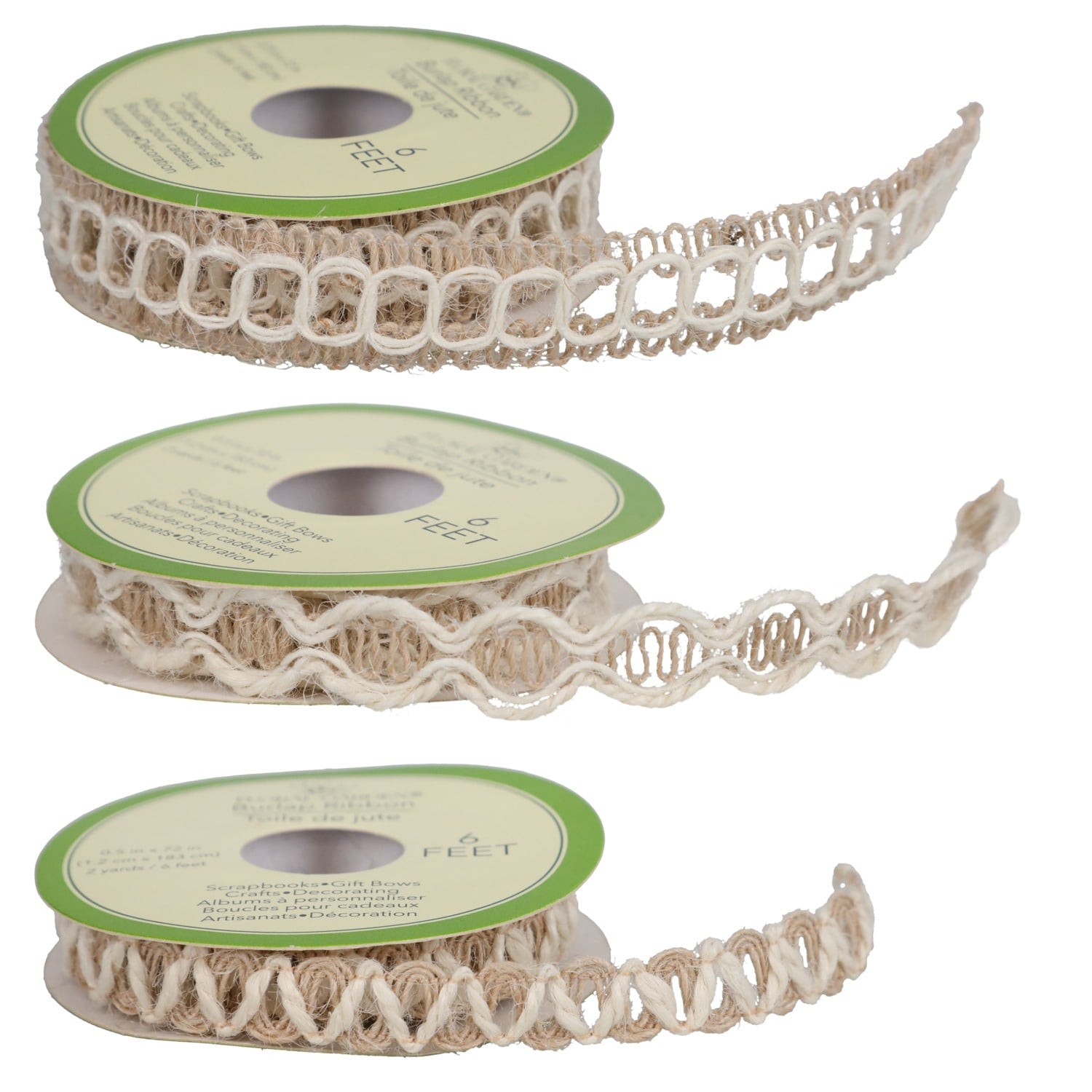 Comes with (Pack of 40). These 2-yd. rolls of Floral Garden(TM) Crochet Burlap Ribbon are great for adding borders to scrapbook pages, creating bows for gifts, decorating your home, and more! Assorted among the three styles shown, each roll is either 0.5-in. wide or 0.75-in. wide. An elegant choice for dressing up reception halls, floral bouquets, and table centerpieces!