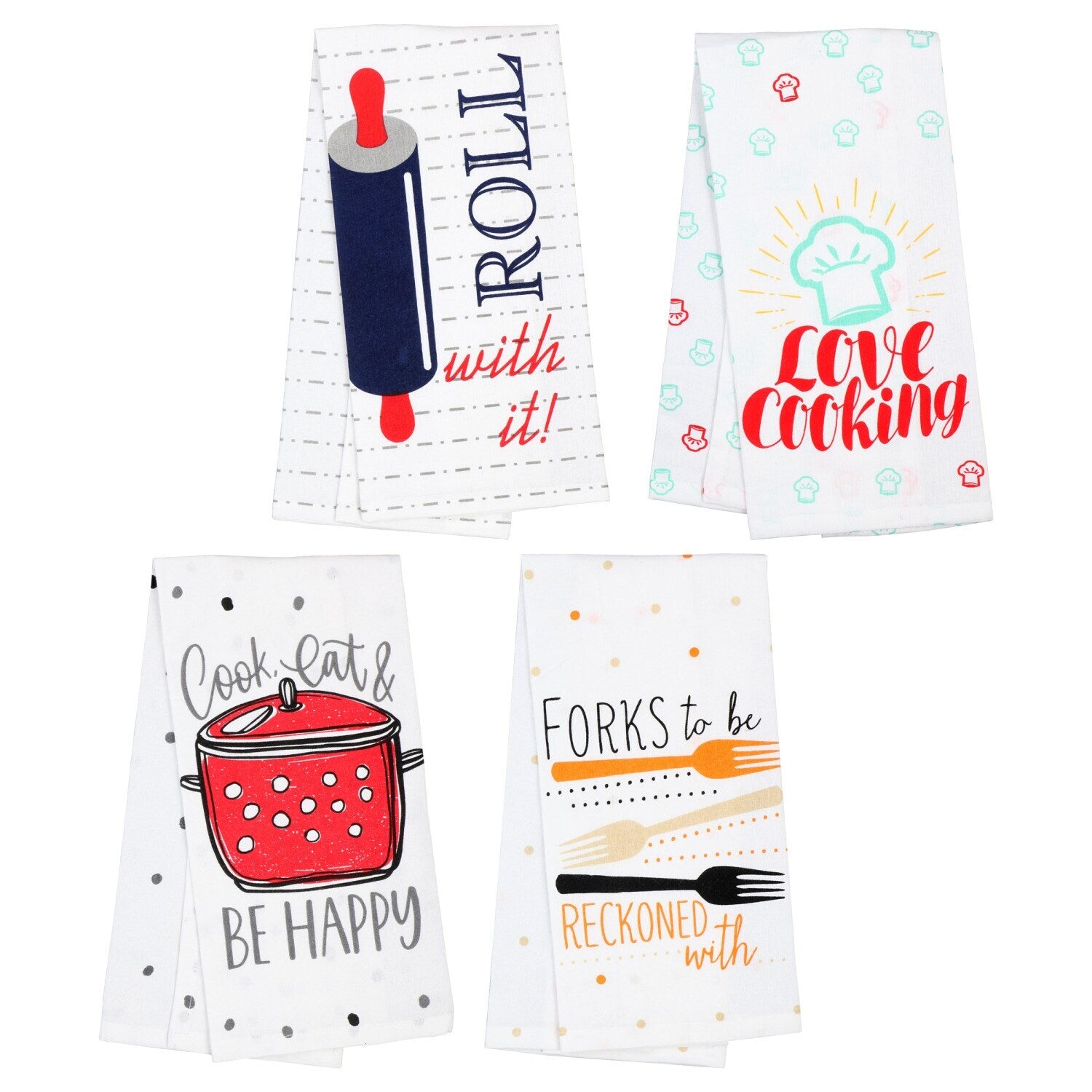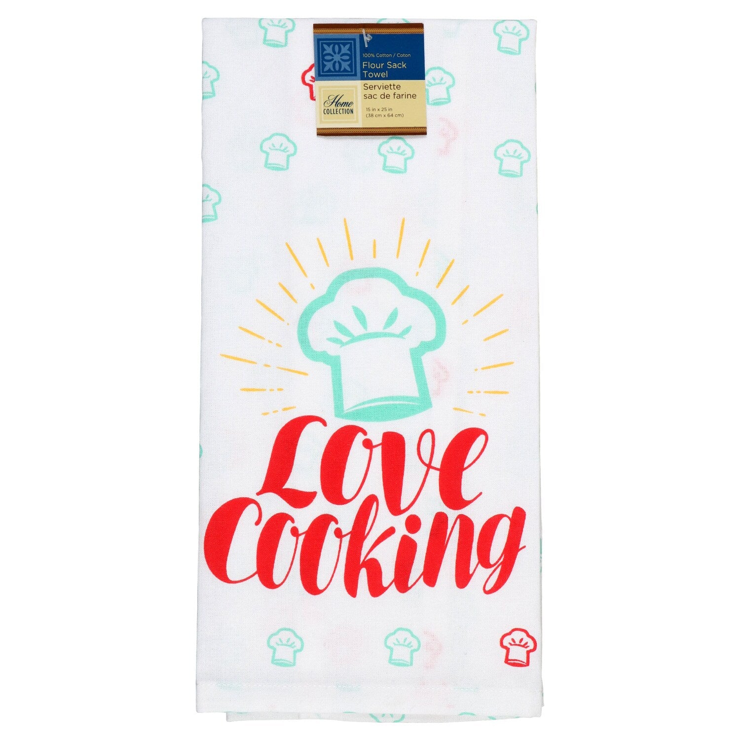 Comes with (Pack of 24). Add a splash of fun to your kitchen decor with these printed flour sack towels! Why compromise fashion for function? These towels will help dry dishes, hands, and keep your work space clean. Each is printed with one of 4 fun designs that are all themed to inspire a love for cooking and baking. Perfect for your home kitchen, the office break room, catering halls, and resale. Assortment may vary.