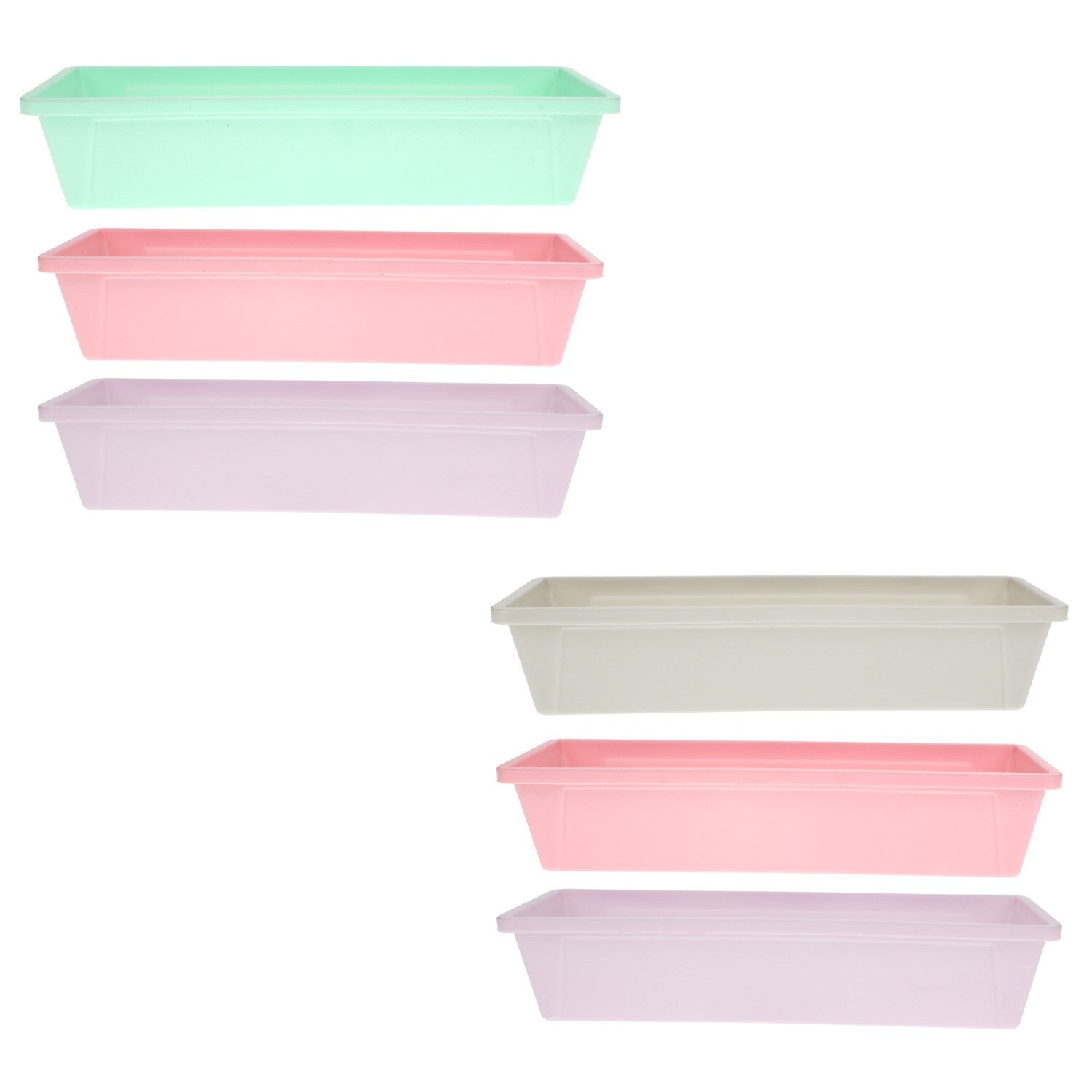 Comes with (Pack of 36). These simple and versatile plastic trays can store and organize a wide array of items. Assorted between two 3-ct. packs - blue, lime green, and pink, or aqua, orange, and purple - each tray measures 8.875x2.875-in. around and 1.75-in. tall. Ideal for organizing your dresser drawers, crafts, sewing notions, school and office supplies, tools, hardware, kitchen and bath accessories, and more.