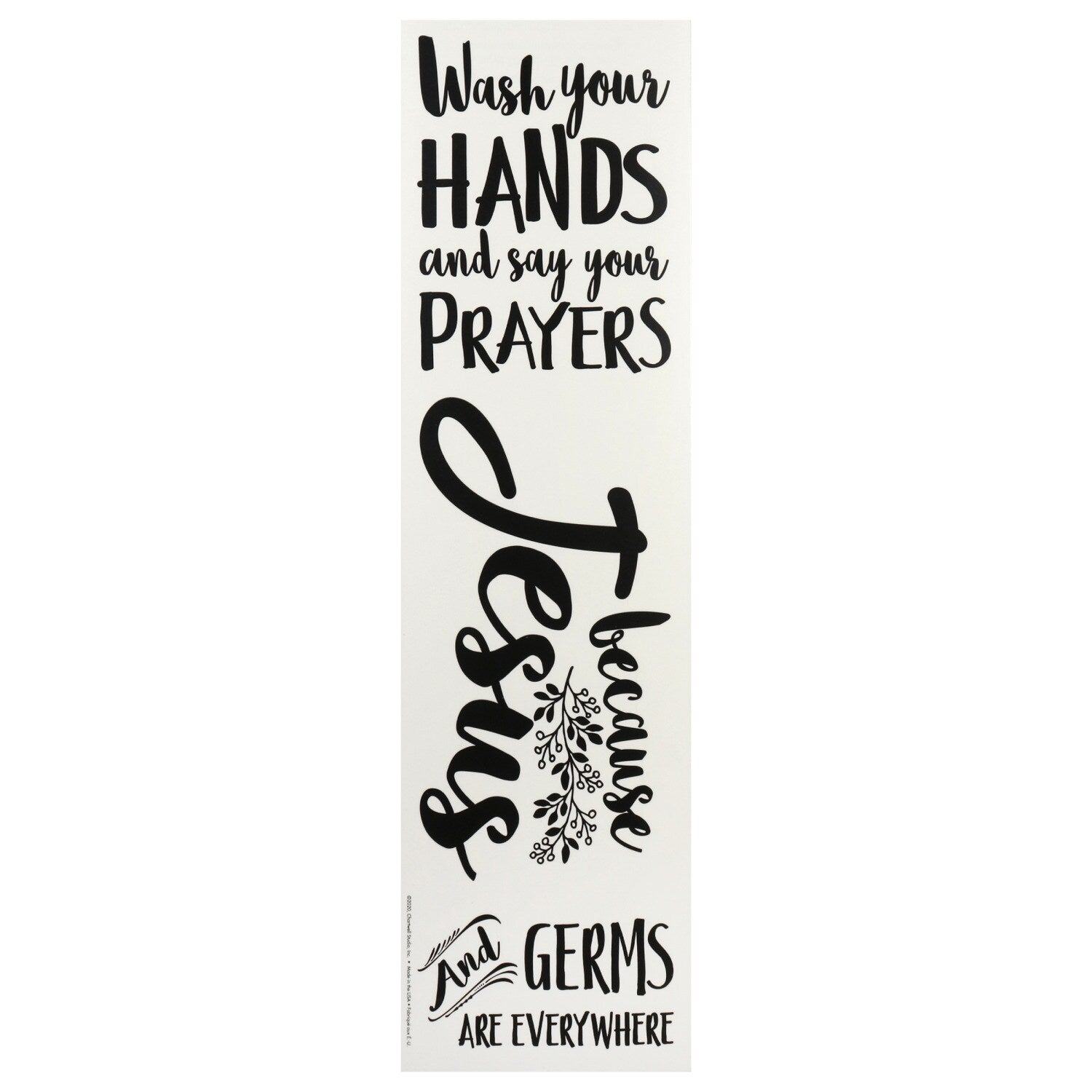 Comes with (Pack of 12). These Jesus and Germs Jumbo Wall Stickers are great additions to any of your bathrooms, whether you apply them directly to the wall or on another surface that you are hanging in the bathroom. These 15.875x4.0-in. peel and stick wall decals are removable and feature the words "Wash your hands because Jesus and germs are everywhere." They are removable, are safe for walls, and are acid free. Simply apply to a clean, dry surface!