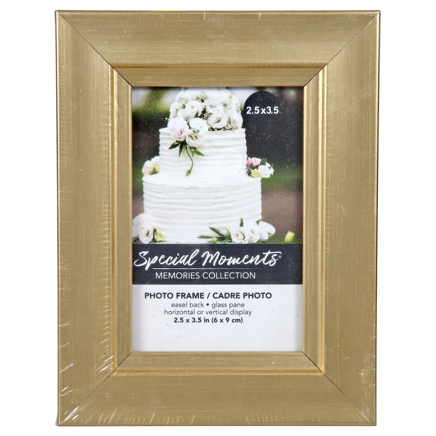 Comes with (Pack of 12). These Special Moments® Memories Collection Mini Gold Photo Frames will complement any occasion - whether you're marking tables for a wedding or framing your favorite memories! Each frame measures 3.75x4.75-in. but holds a 2.5x3.5-in. photo or decoration. These charming gold frames can be wall-mounted or placed on shelves and tables with the attached easel back stand. Designed for both horizontal and vertical display, these mini frames are perfect for home and office decor or decorating for events and parties!