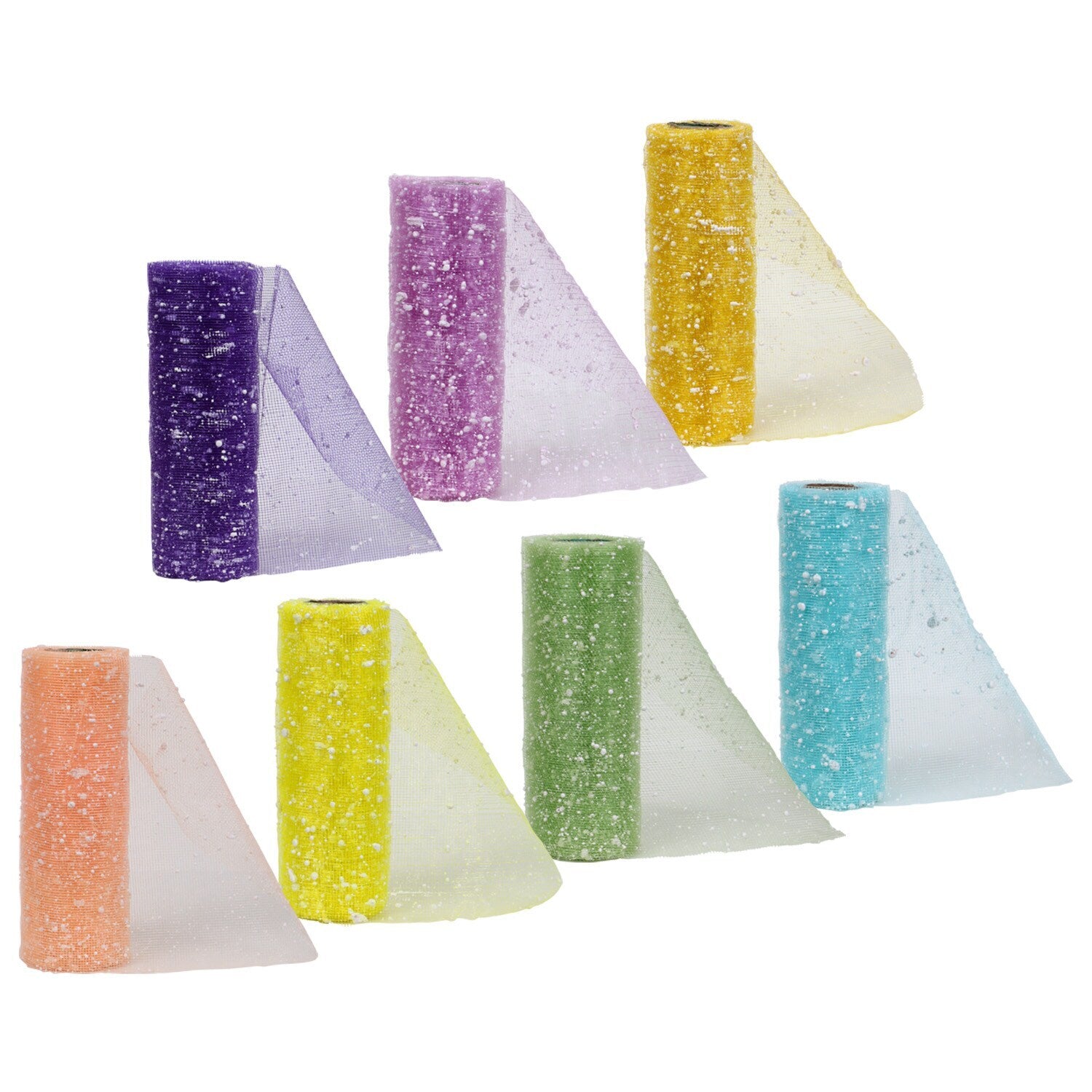 Comes with (Pack of 21). Floral Garden Deco Mesh with Glitter is ideal for so many of your crafts and DIY projects. They are great for making wreaths and decorating. The sparkle from the glitter in the material really adds to any project where they are applied. They are assorted among Aqua, Green, Peach, Purple, Dark Purple, Turquoise, and Yellow.