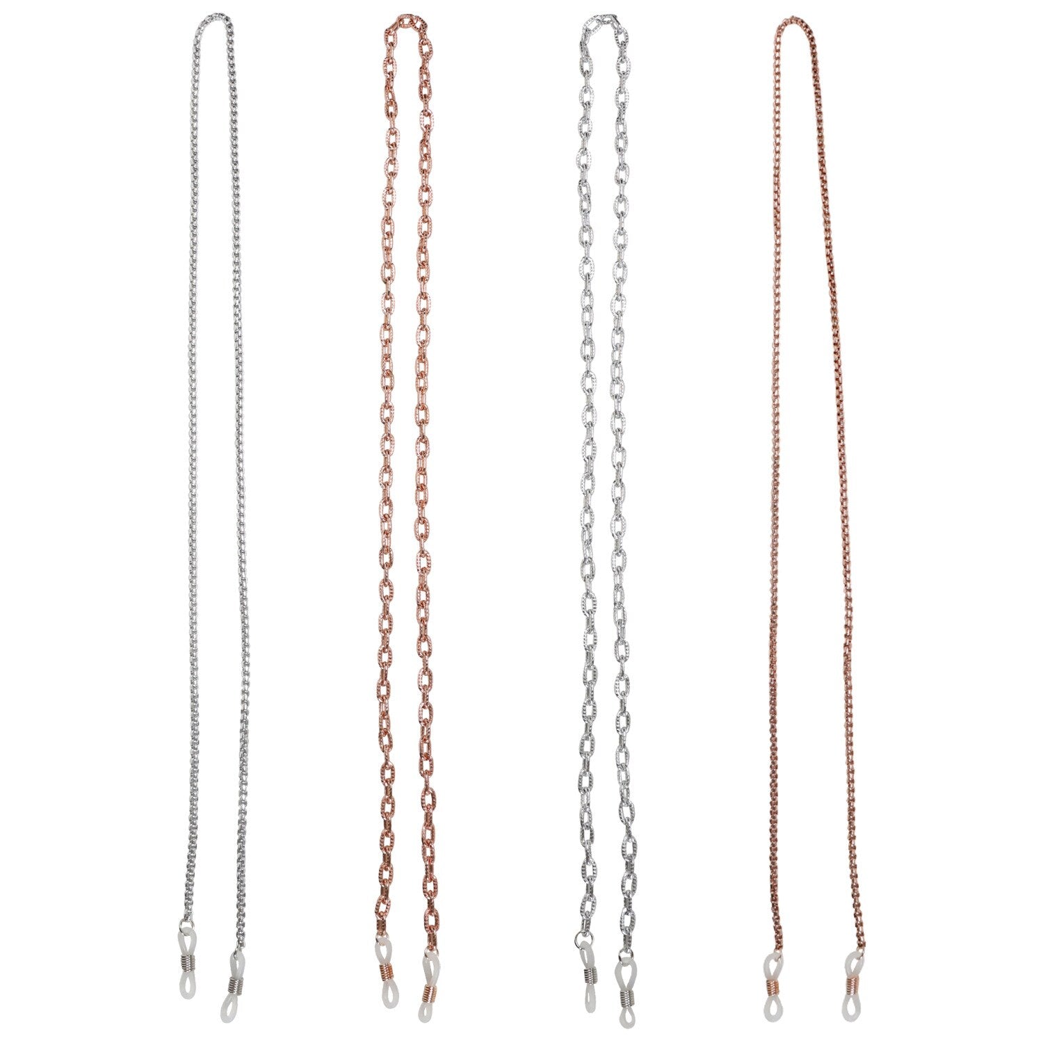 Comes with (Pack of 48). Keep track of your glasses with these stylish Metal Eyeglasses Cords! Assorted among the four silver- or gold-colored chain styles shown, these 26-in. eyeglass cords are made from copper and have rubber fasteners to secure them to the ends of your glasses. Great for reading glasses, blue light glasses, sunglasses, and more!