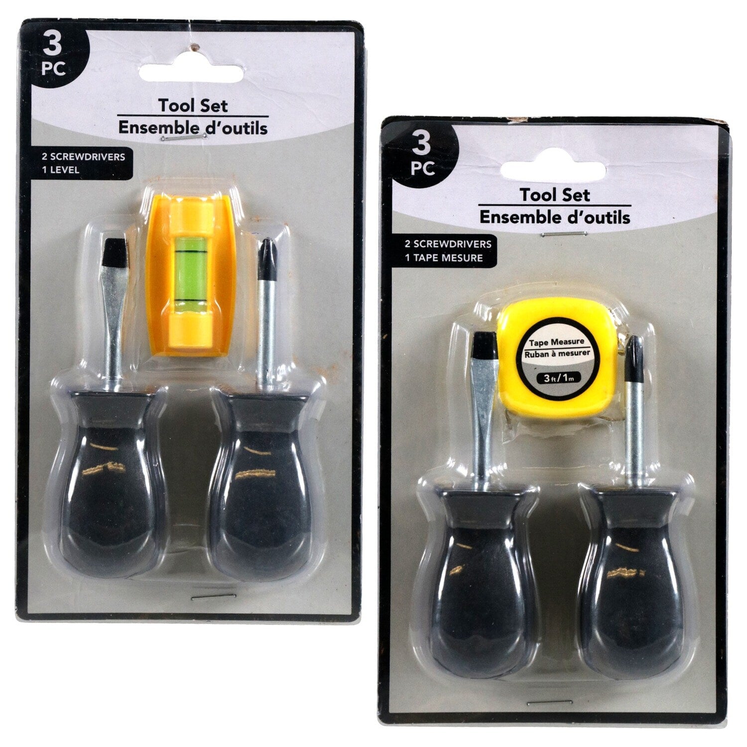 Comes with (Pack of 24). Always keep a basic tool set on hand for those unexpected home repairs. These handy dandy tool sets include 1 Phillip's head screwdriver, 1 flathead screwdriver, and either a level or a 3-ft. long measuring tape.